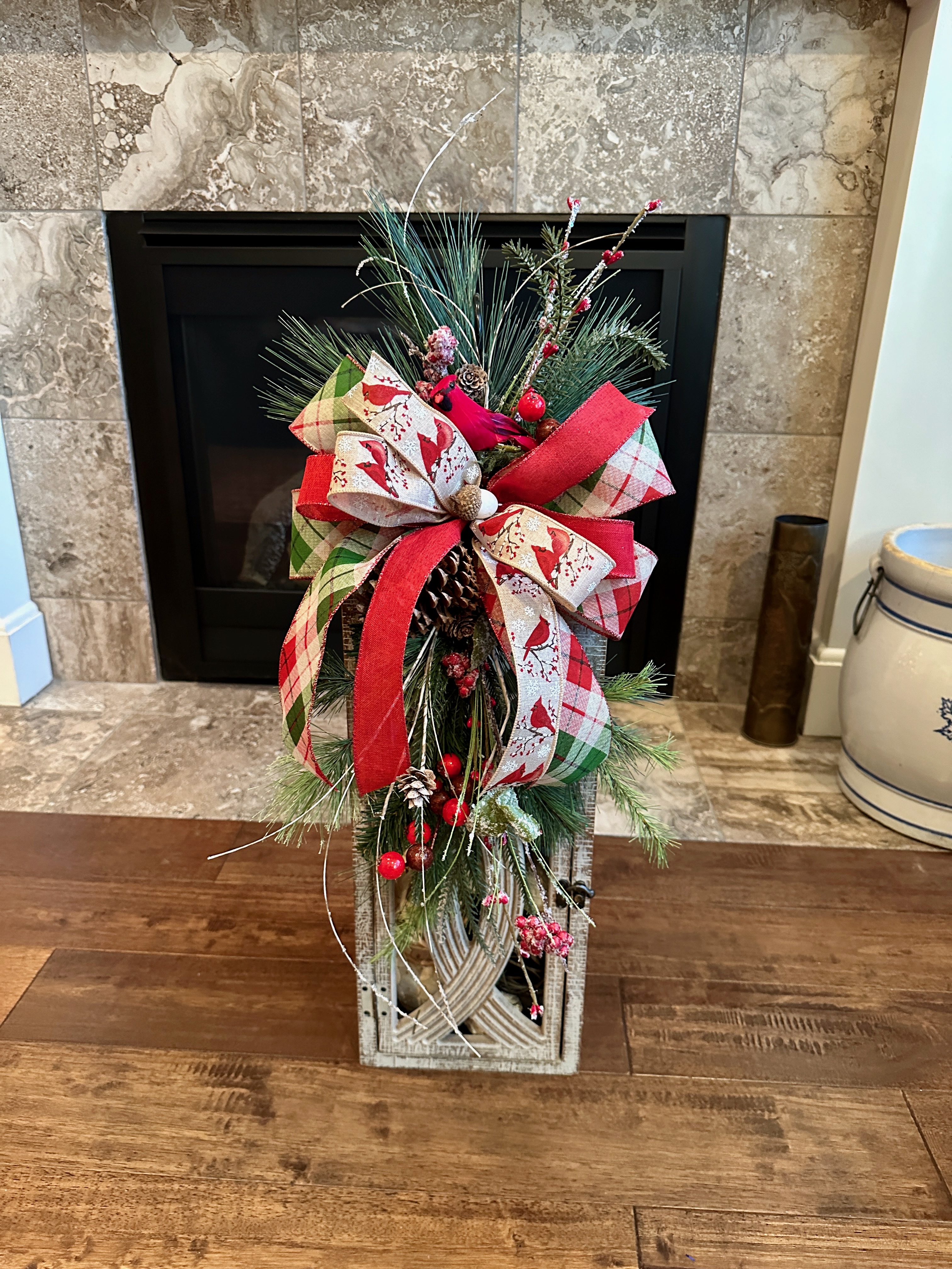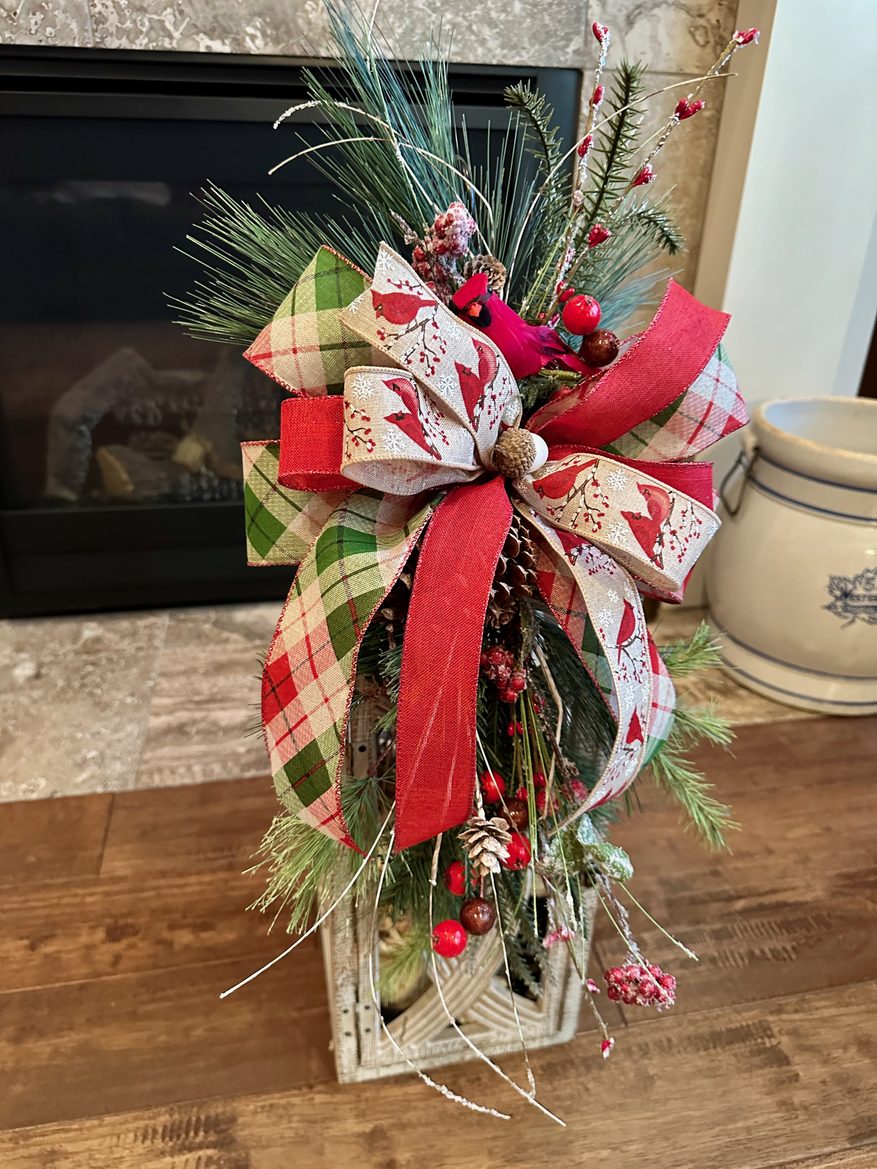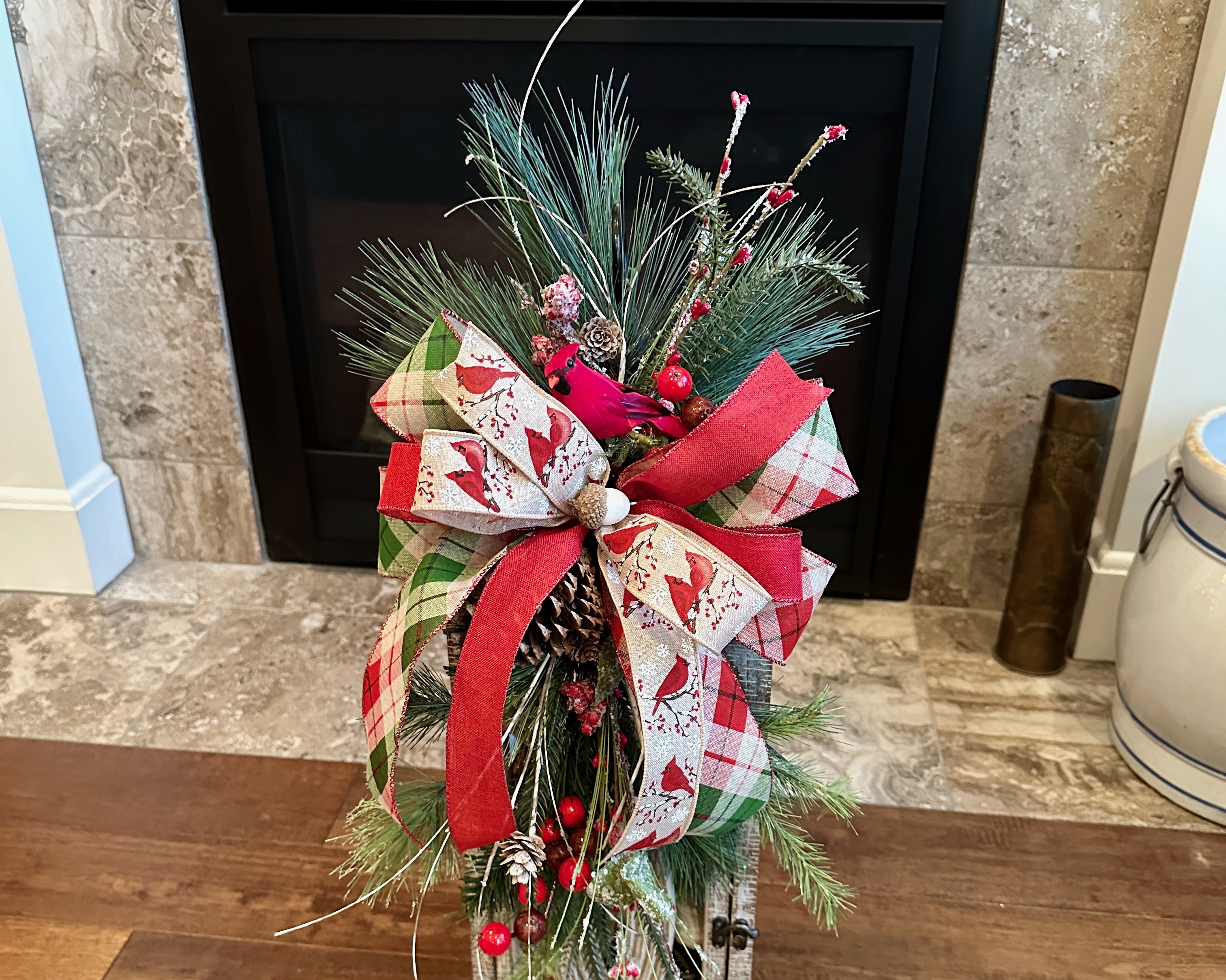 Christmas Evergreen farmhouse lantern swag with iced greenery and large cardinal bow would be a perfect addition to your front porch or fireplace home decor this holiday season.