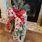 Variety of lightly flocked and iced evergreens with lots of textures, including long needle pine, eucalyptus, and woody stems.
