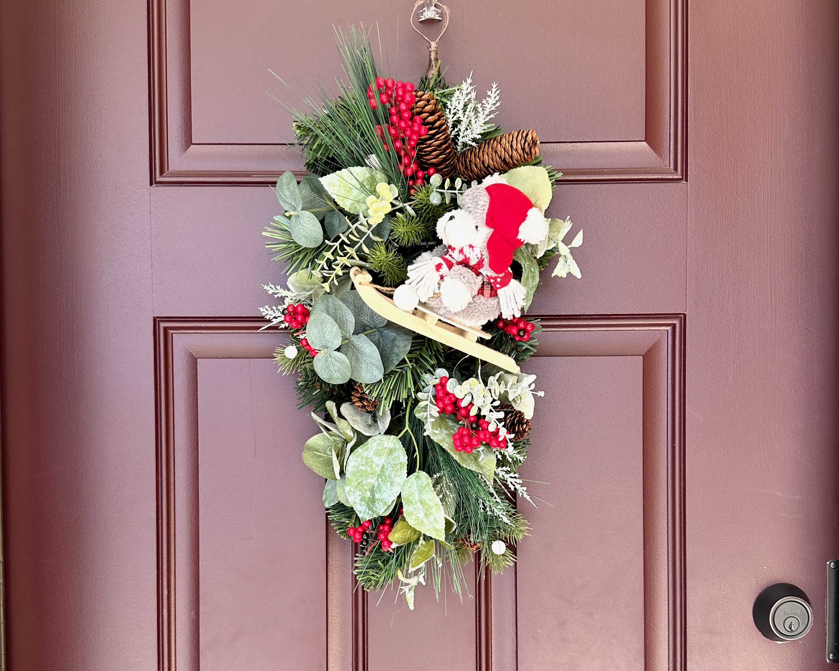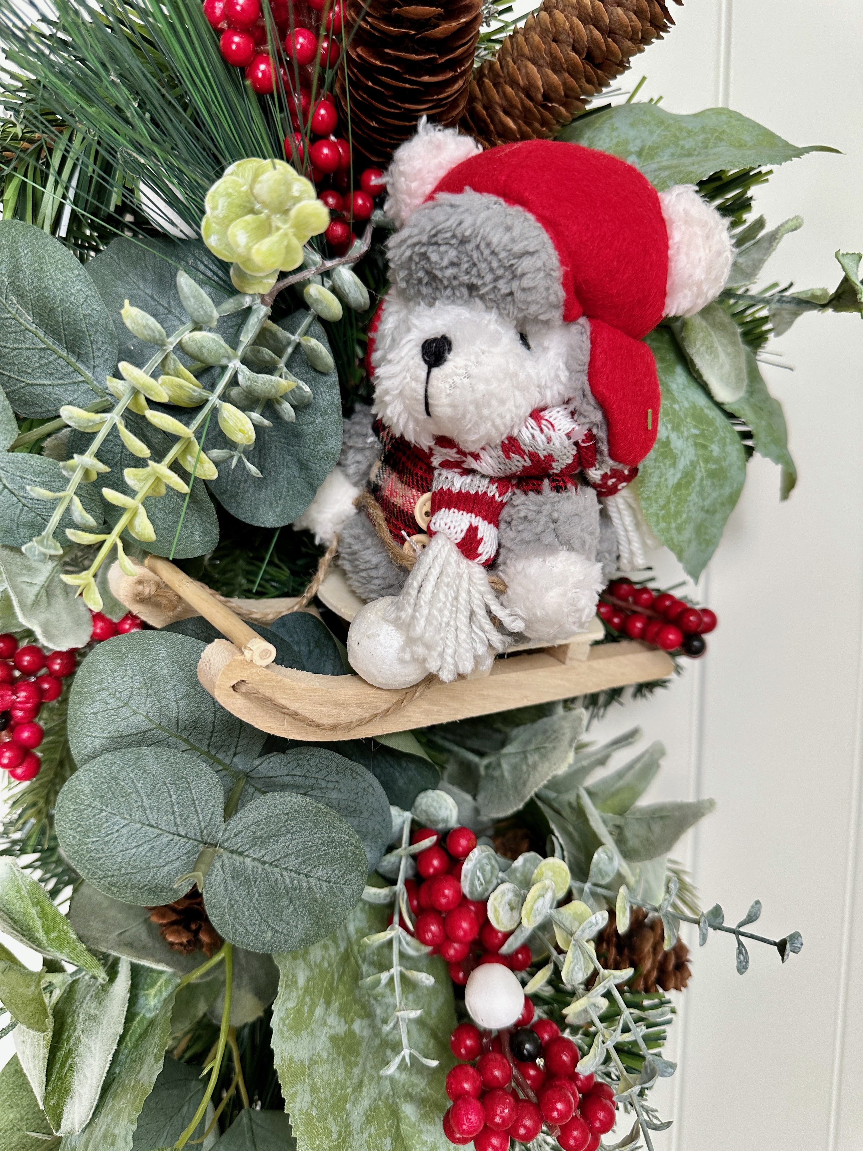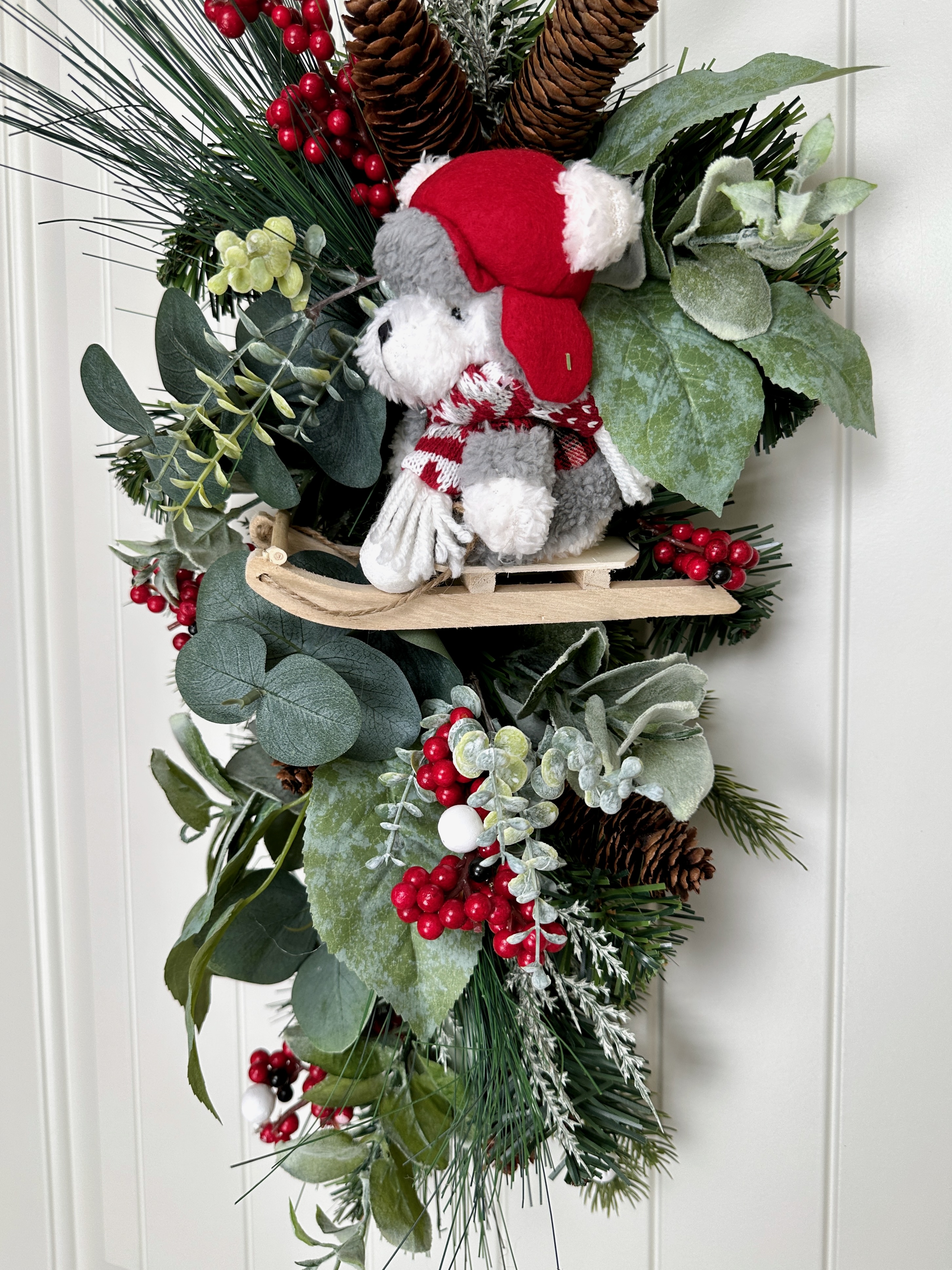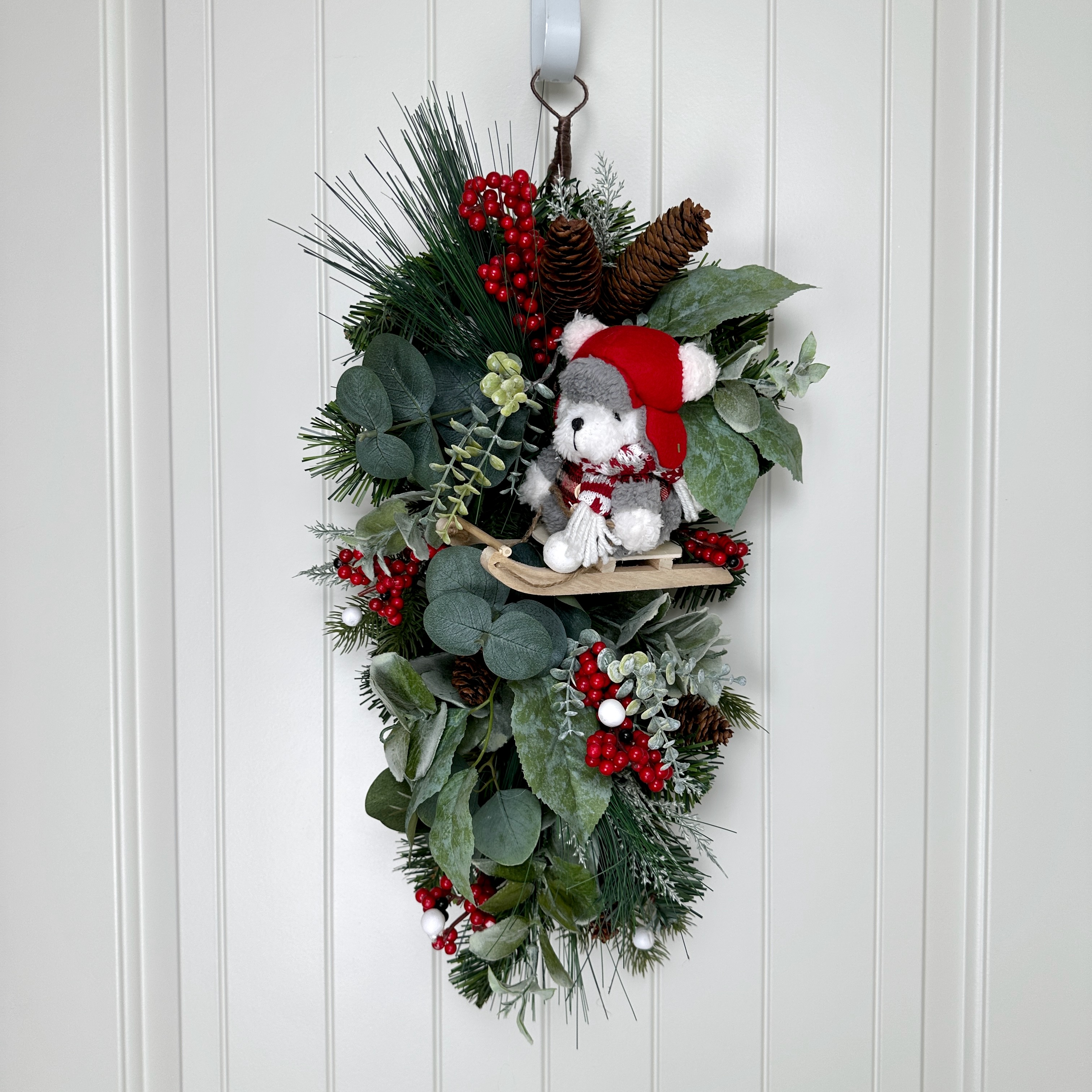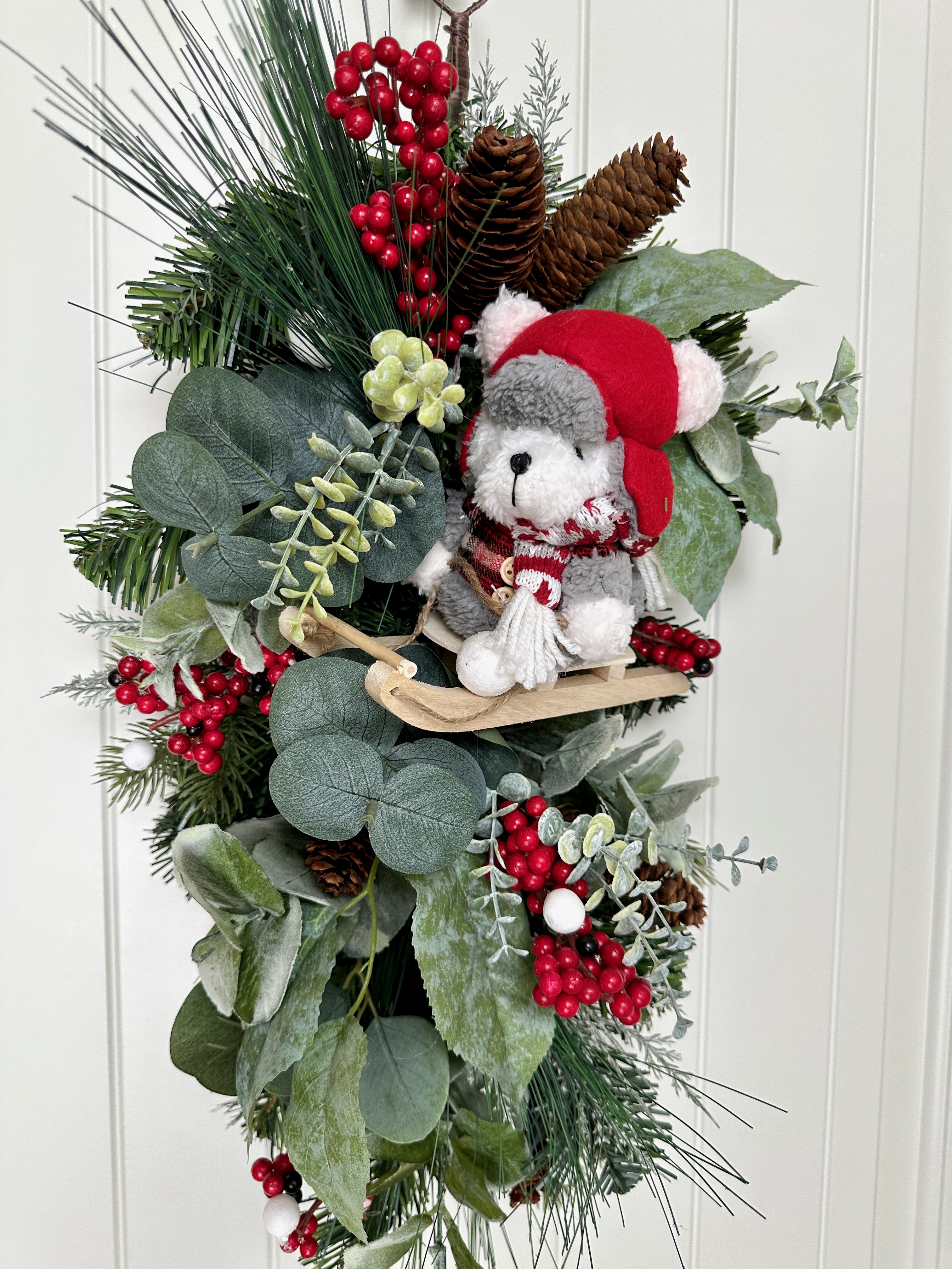 This evergreen Christmas Wall or Door Swag Wreath will add a touch of rustic charm to your holiday decor. A snow bear on a sled and a mix of evergreens, pinecones, and red berries, this door swag is a perfect blend of classic and contemporary holiday styles.