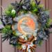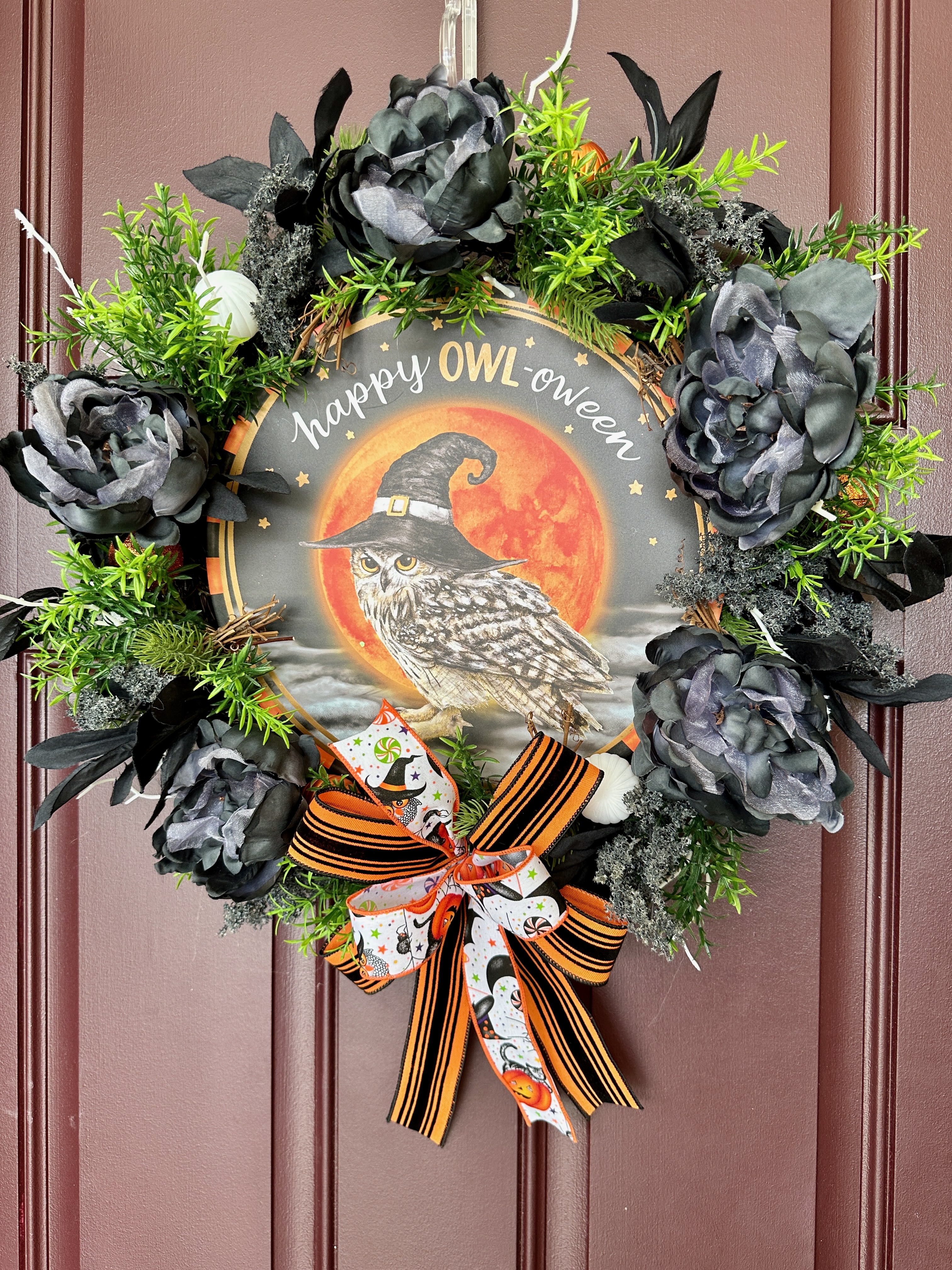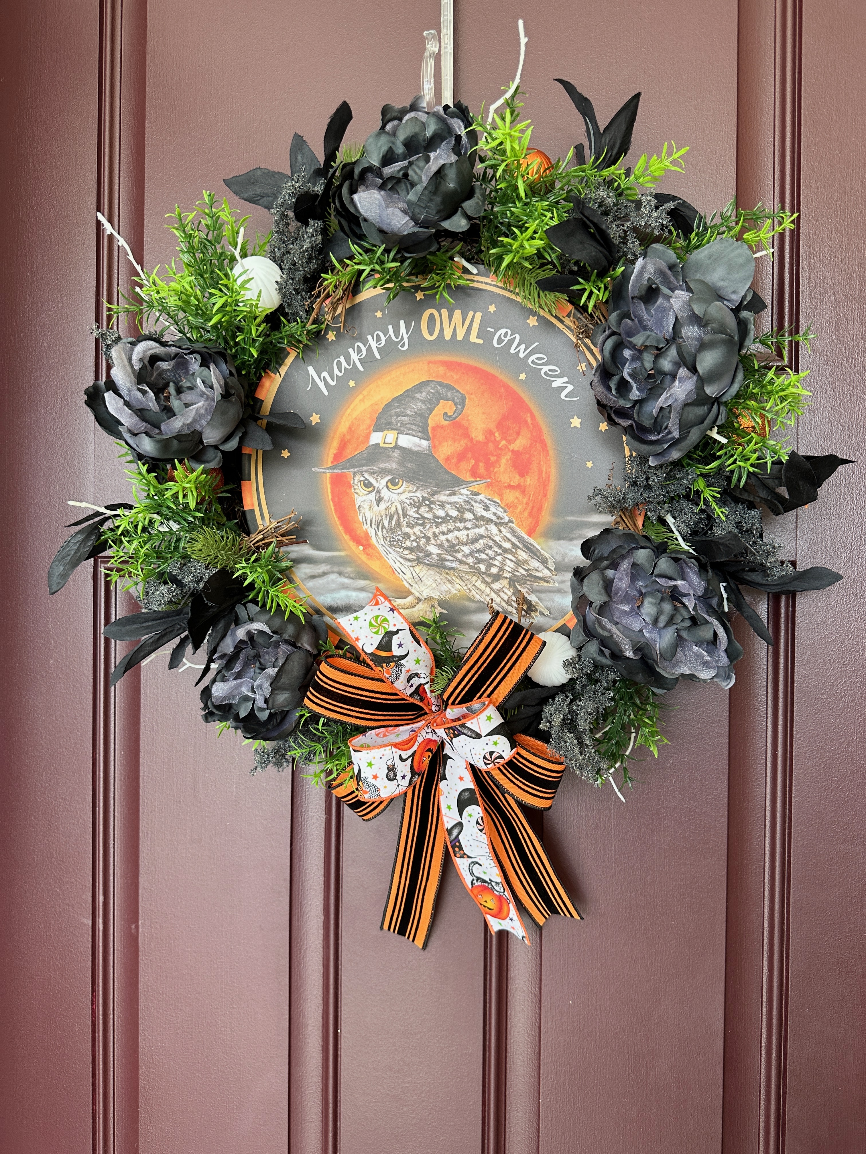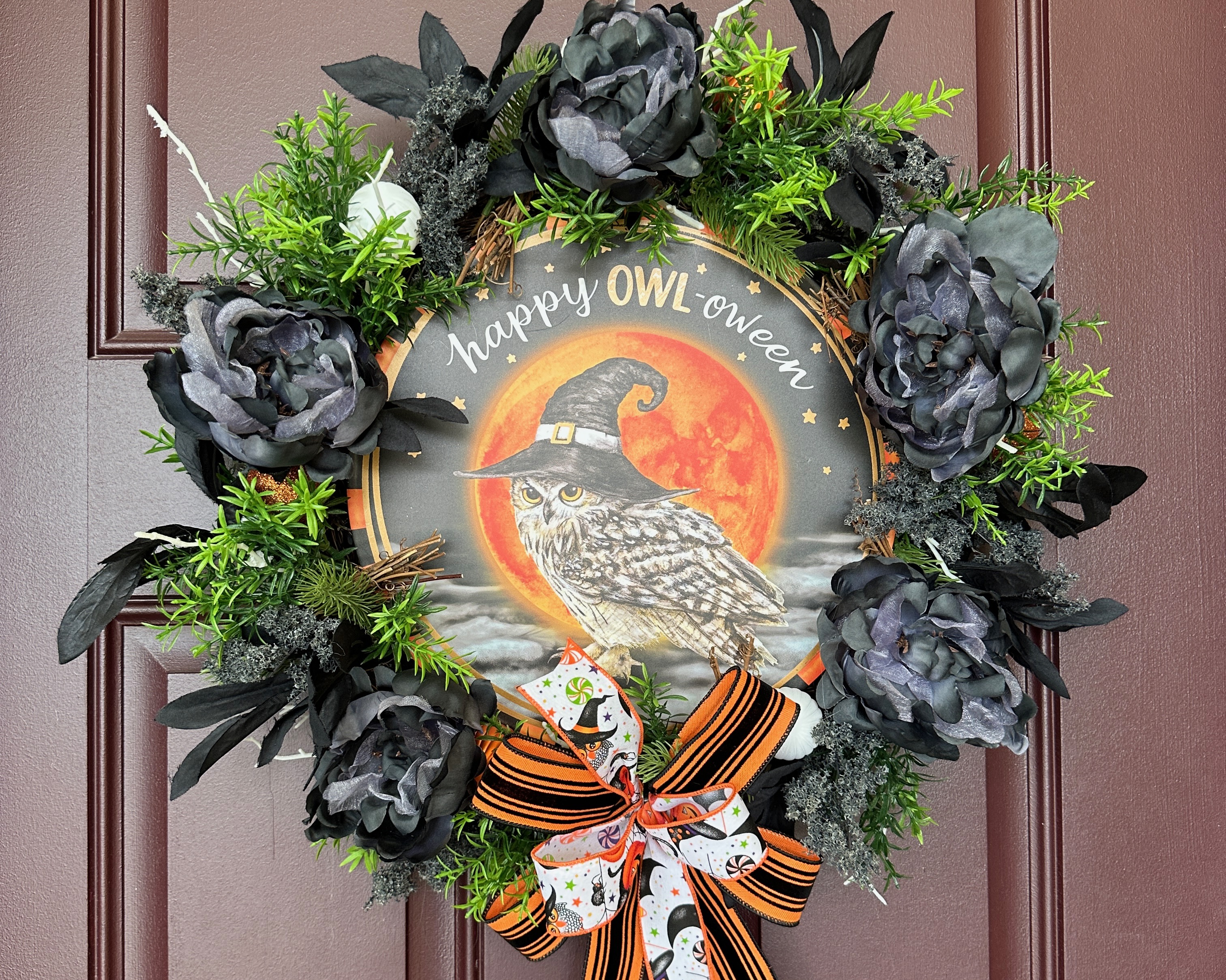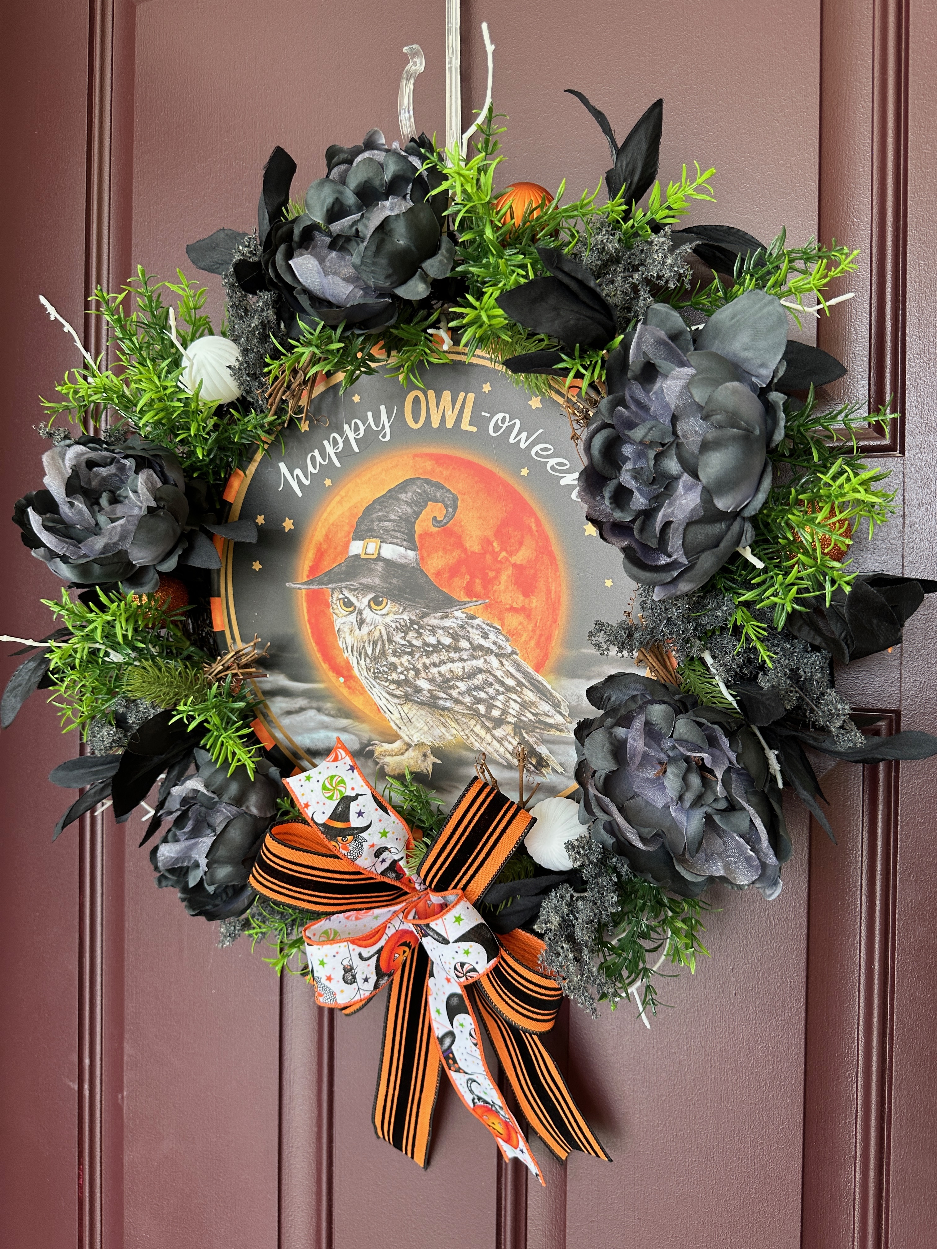 A blend of gothic charm and forest magic, this handcrafted Halloween wreath features eerie black peonies, black moss and greenery. and a captivating owl in a witch’s hat perched against a glowing orange moon.
