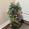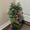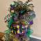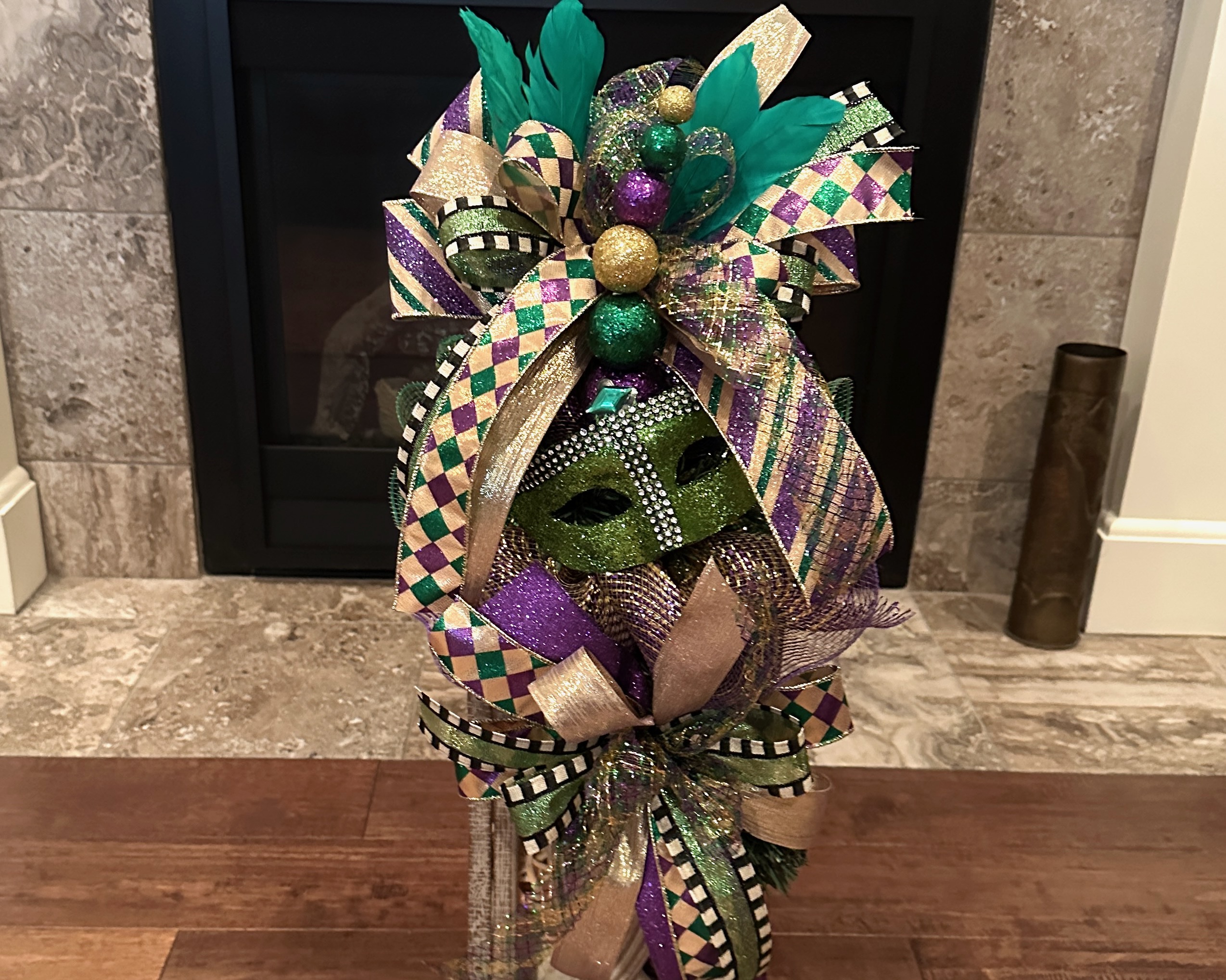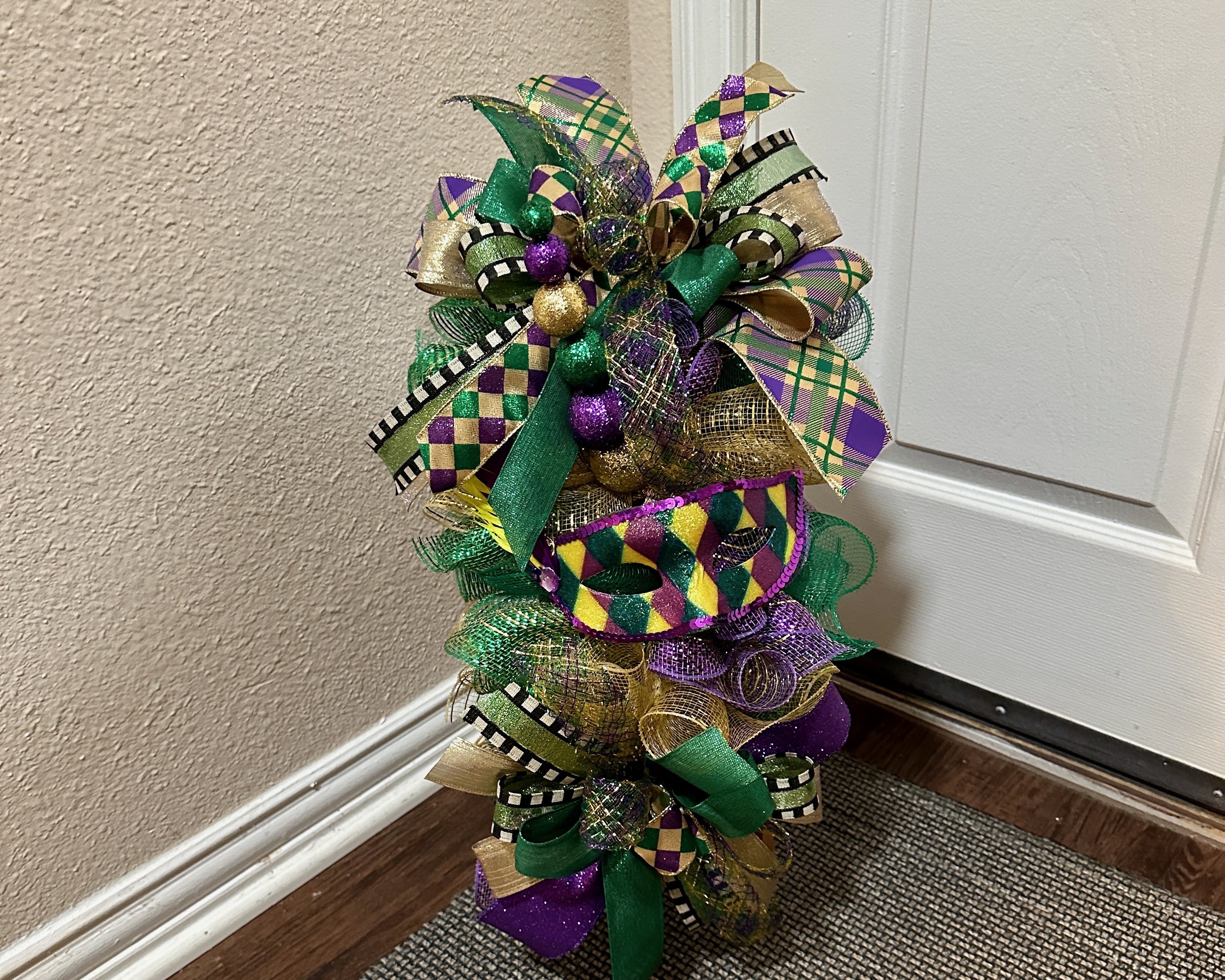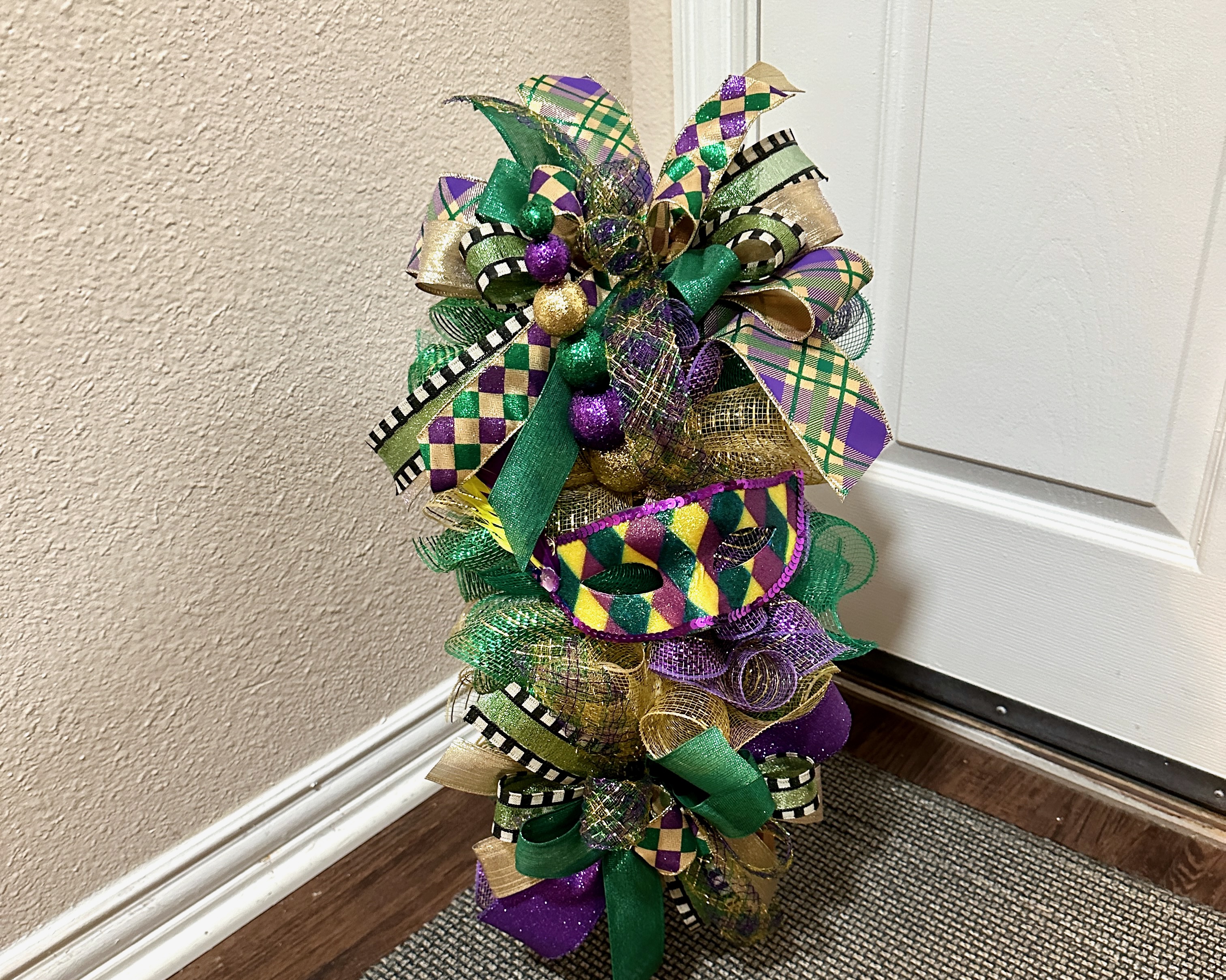 High quality, wired ribbons in Mardi Gras colors and patterns are used to make a large glam and glitter bow at the top with a complementary bow at the bottom. A total of 6 different ribbons are used in this design.