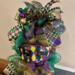 Layers of colorful green, gold and purple mesh add glam to the base.