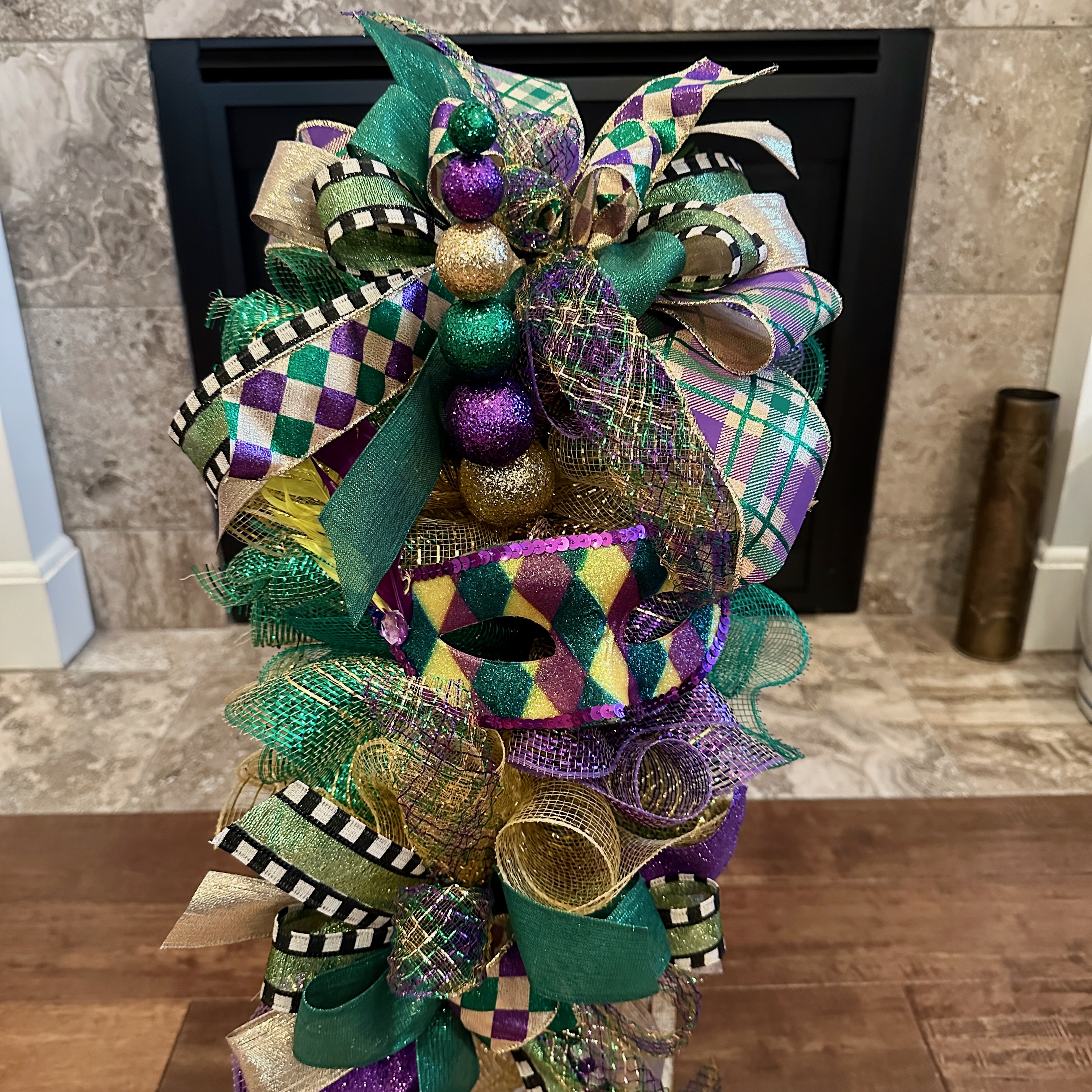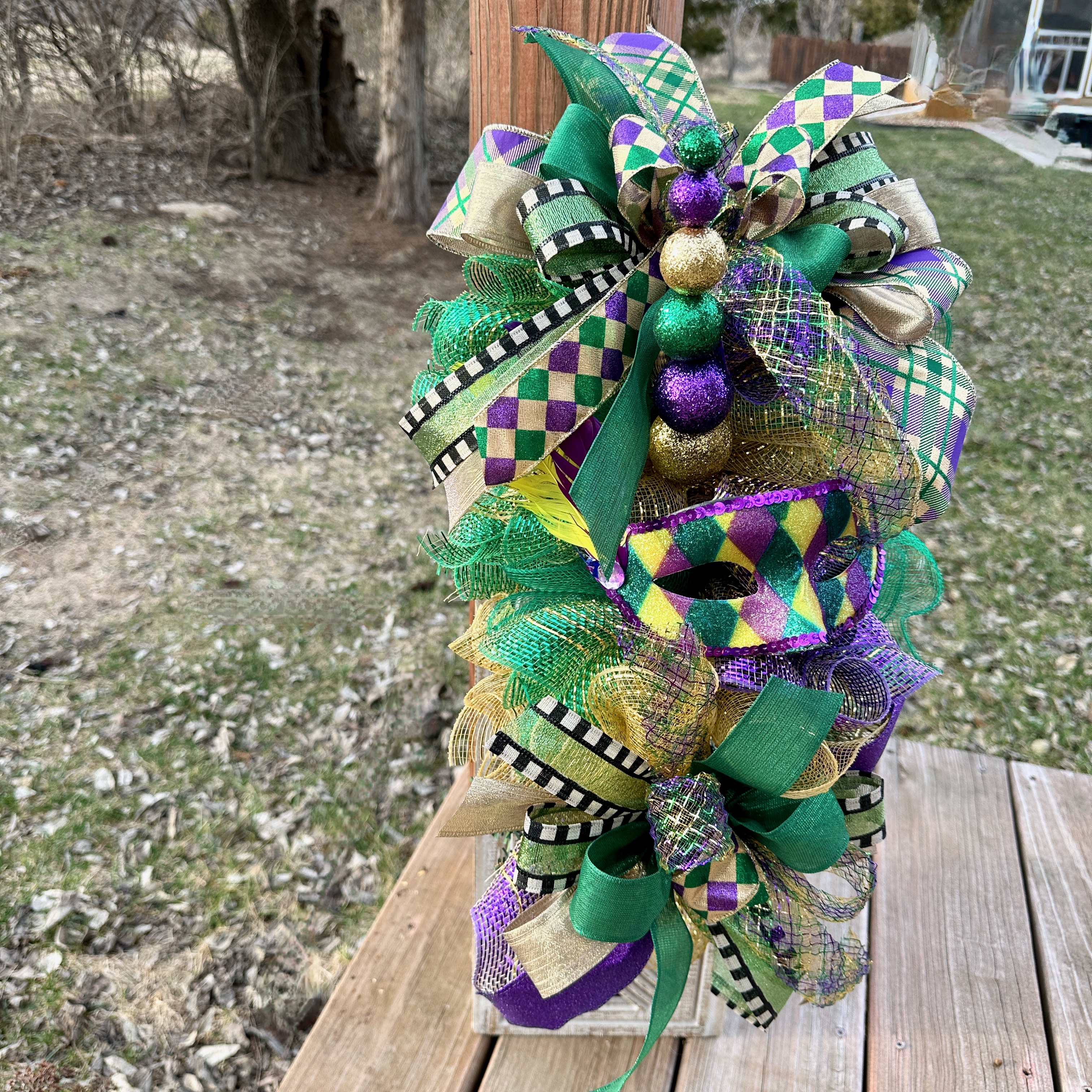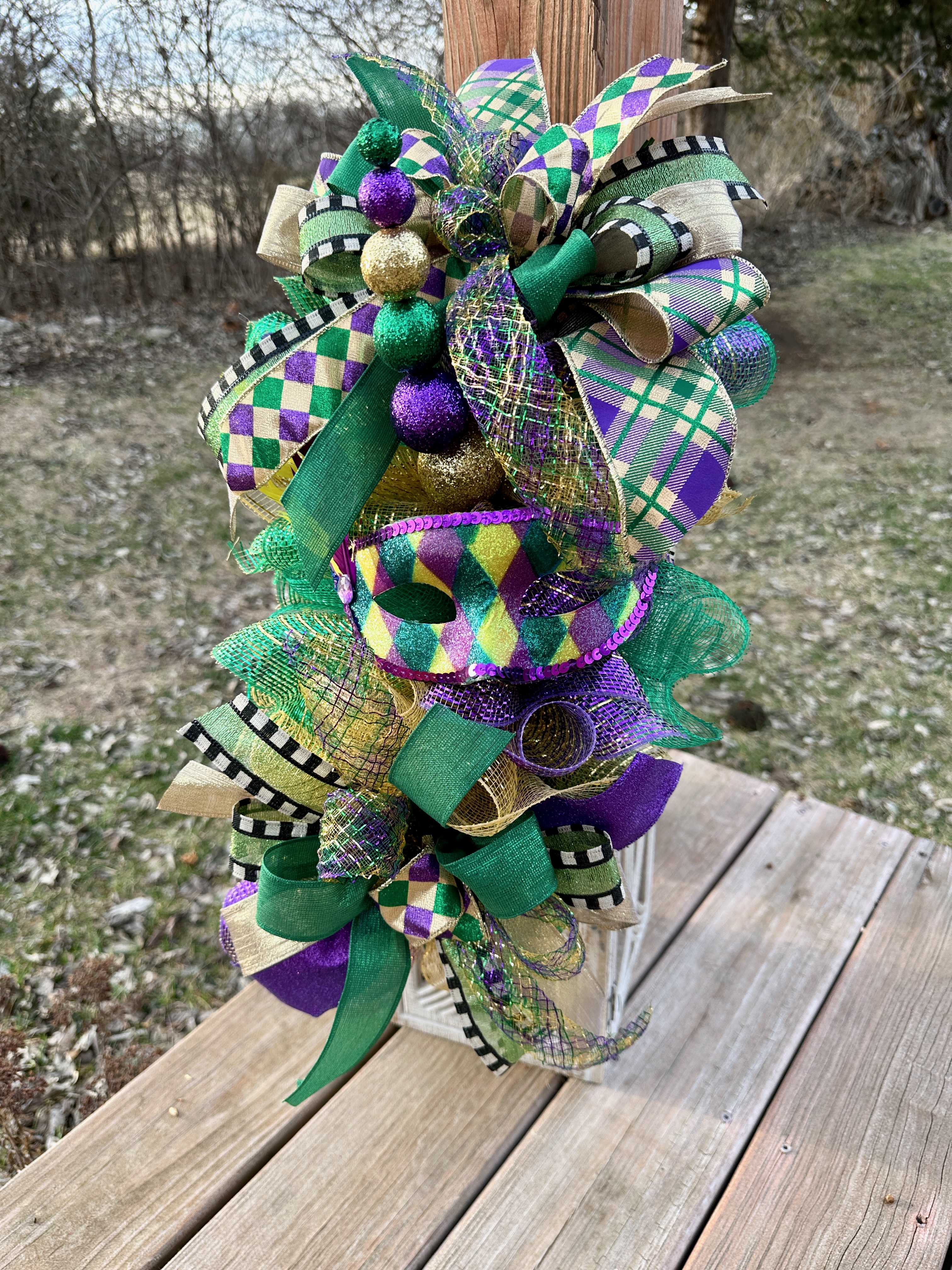 High quality, wired ribbons in Mardi Gras colors and patterns are used to make a large glam and glitter bow at the top with a complementary bow at the bottom. A total of 6 different ribbons are used in this design.