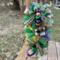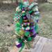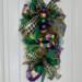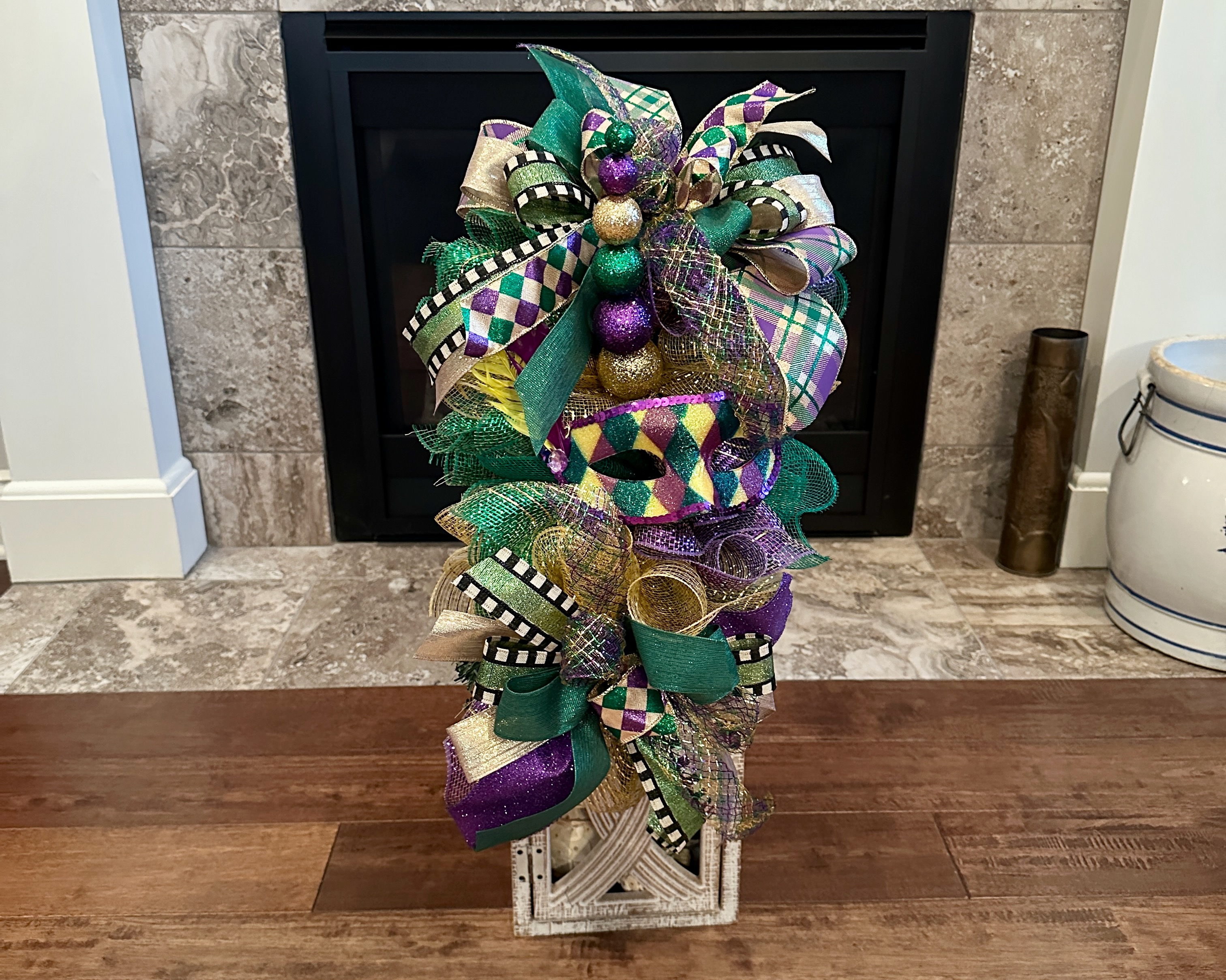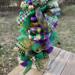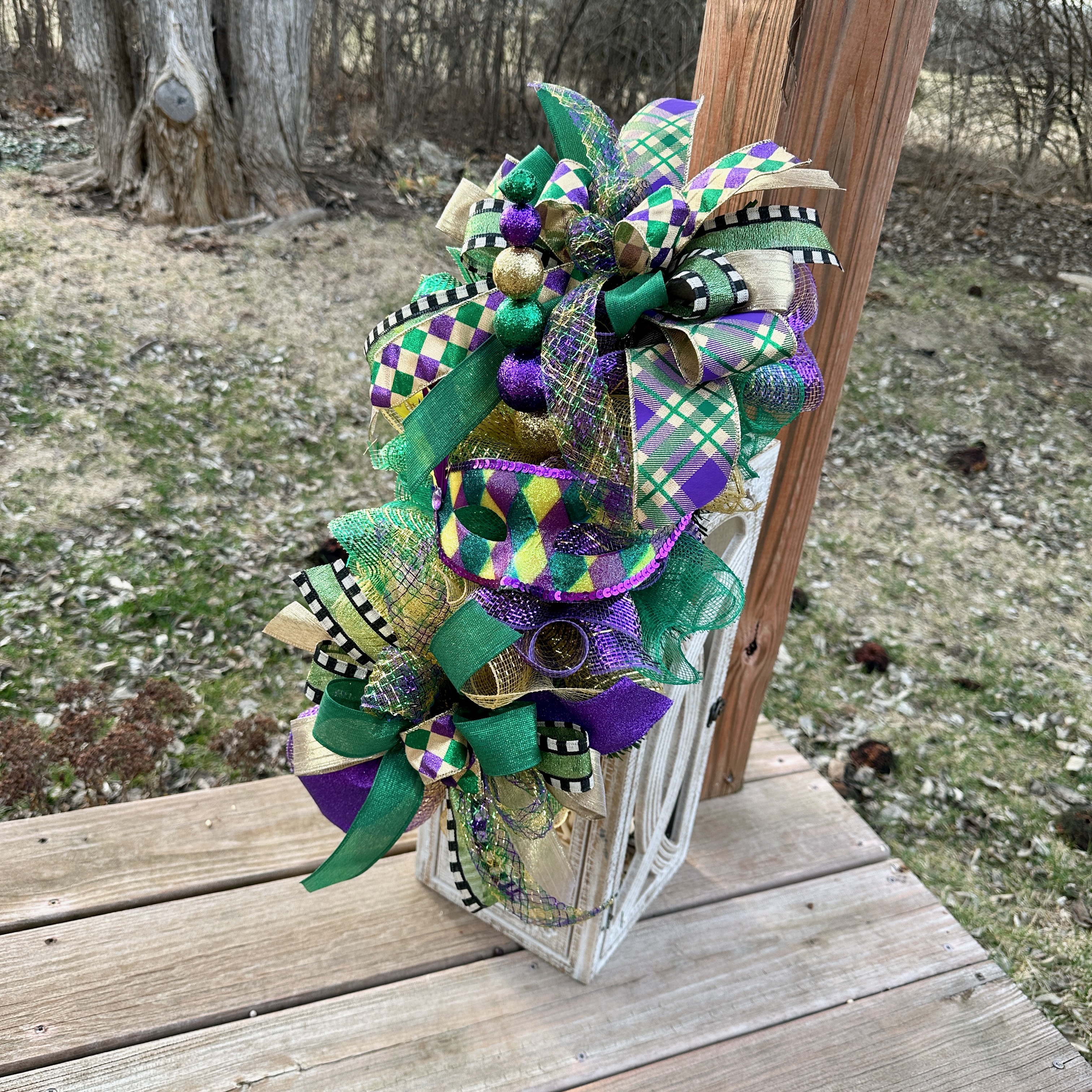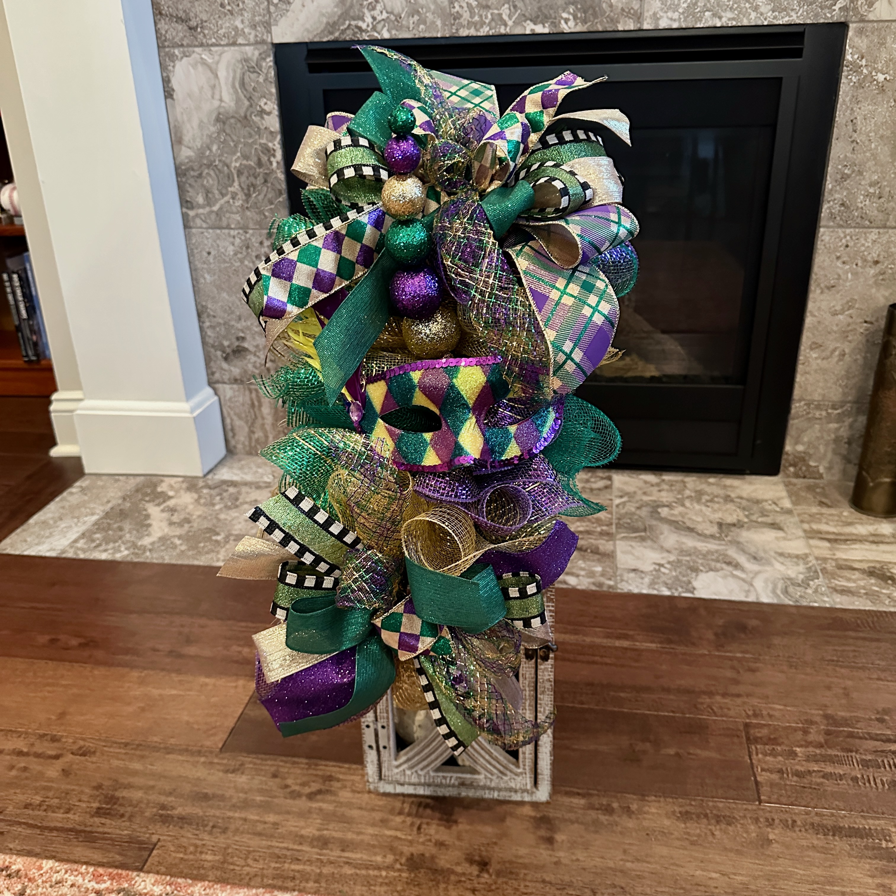 High quality, wired ribbons in Mardi Gras colors and patterns are used to make a large glam and glitter bow at the top with a complementary bow at the bottom. A total of 6 different ribbons are used in this design.