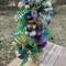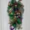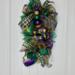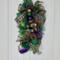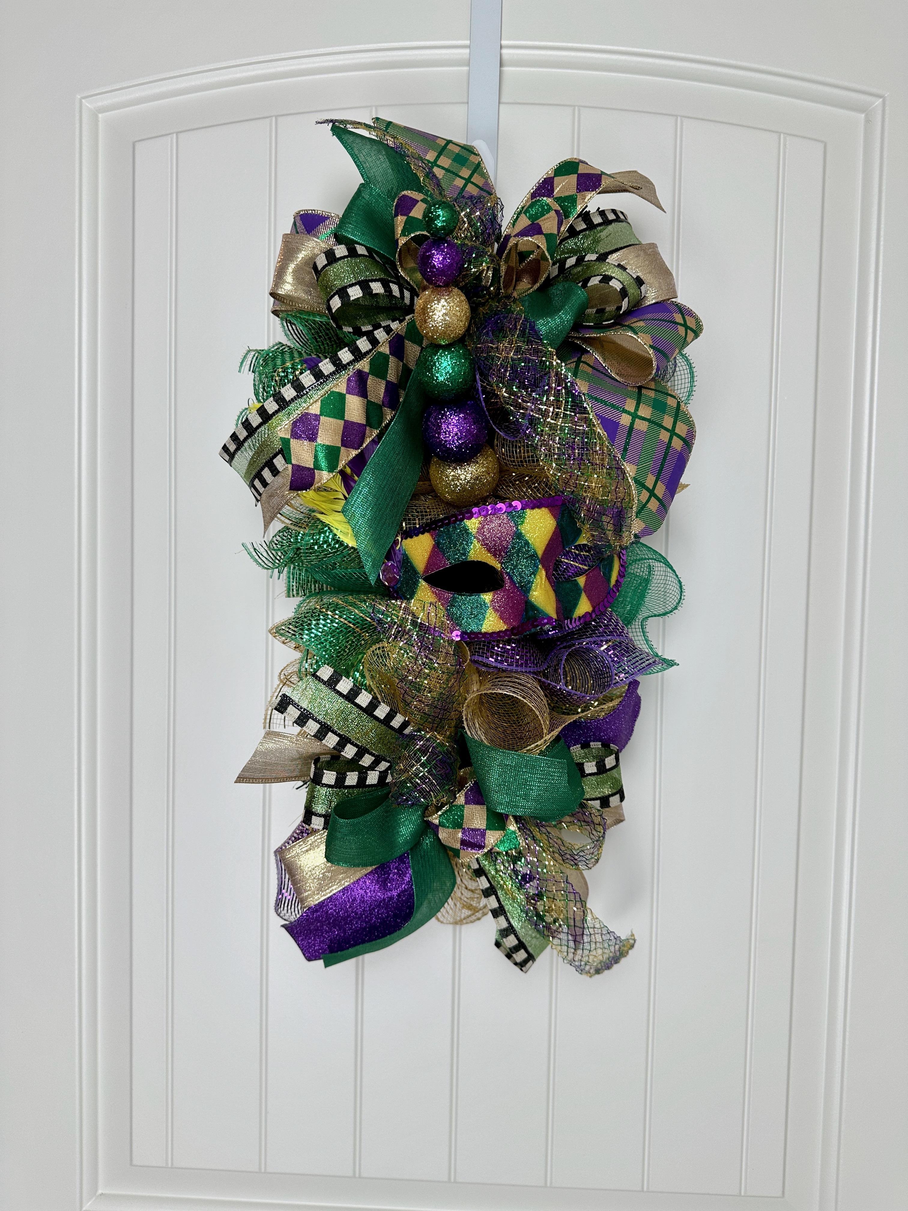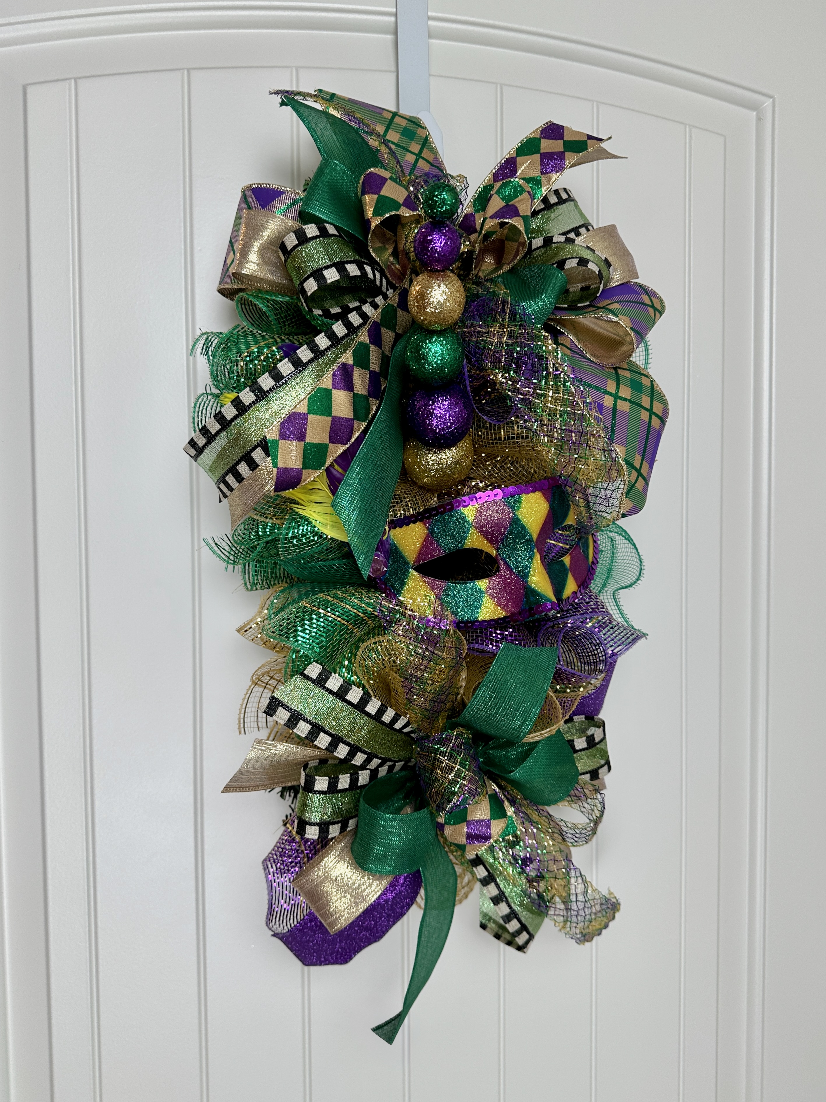 Perfect for celebrating the Carnival season, this colorful large lantern swag features a variety of rich purple, gold, and green ribbons accented with glittering ornaments and a decorative mask.