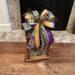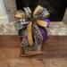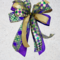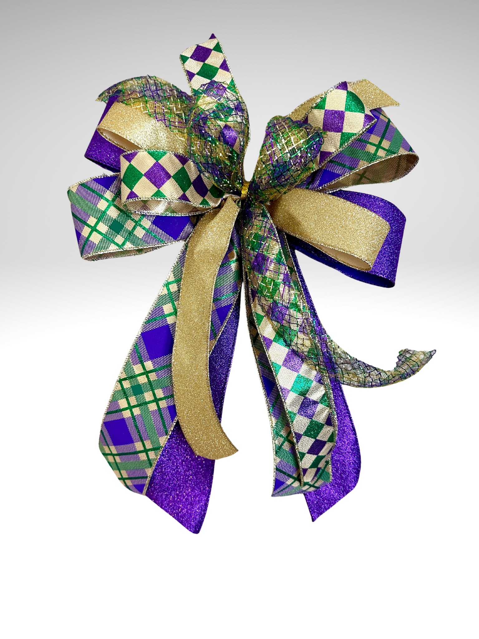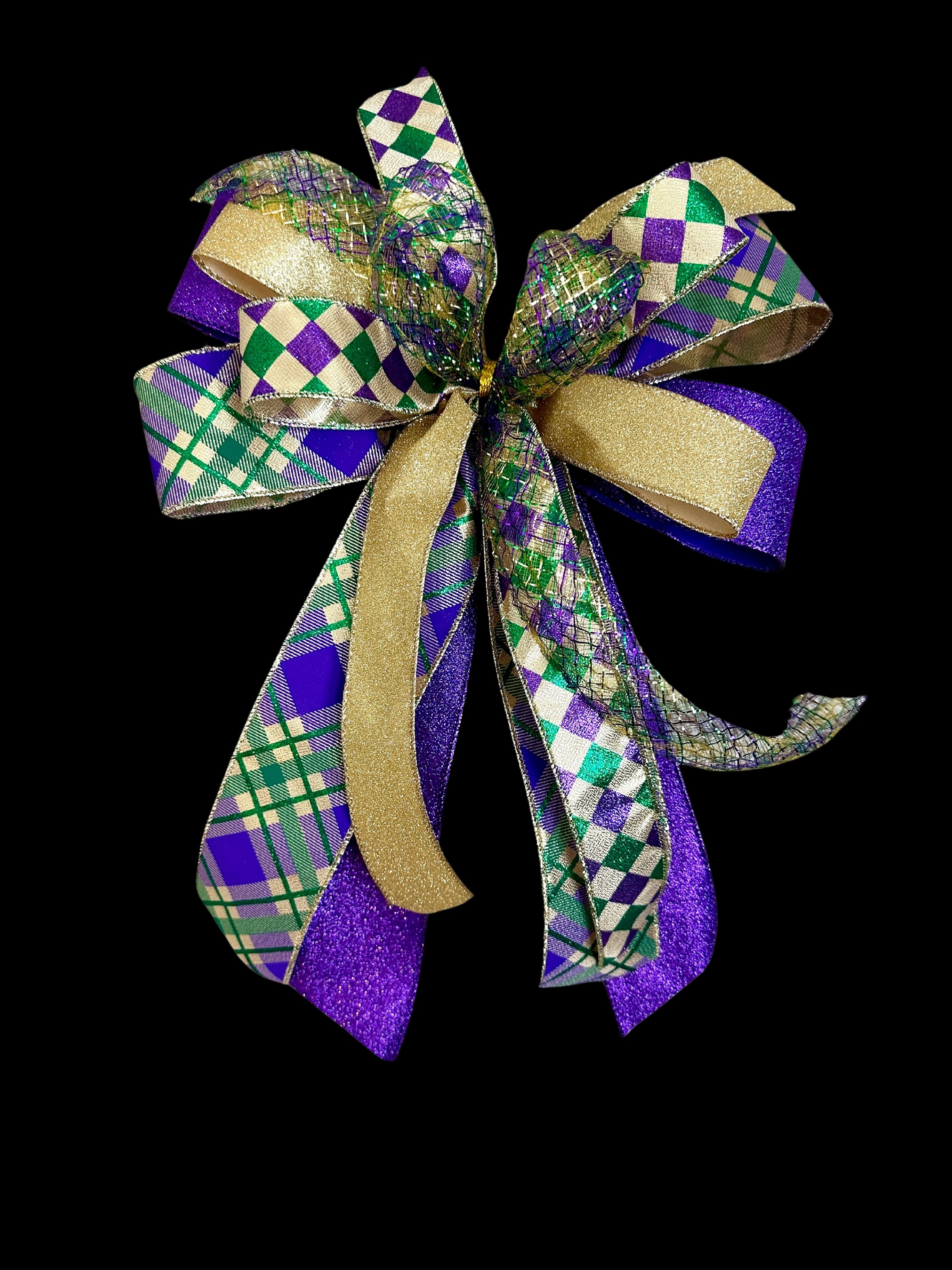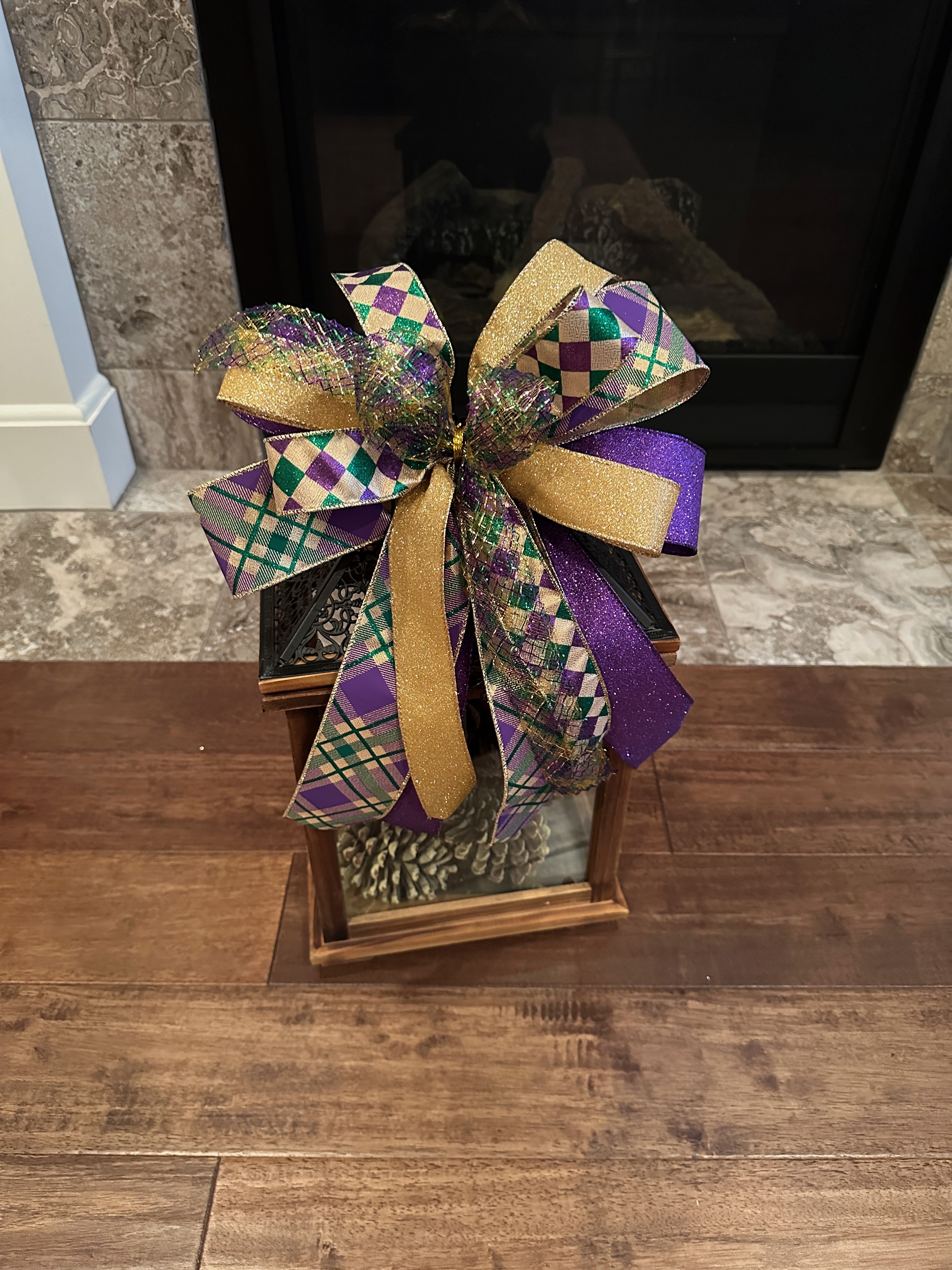 This Mardi Gras purple, gold and green wreath bow decoration with ribbon tails is full of glitter and glam. This large bow is perfect your own wreath, lantern, lamp or light post or bannister.