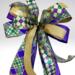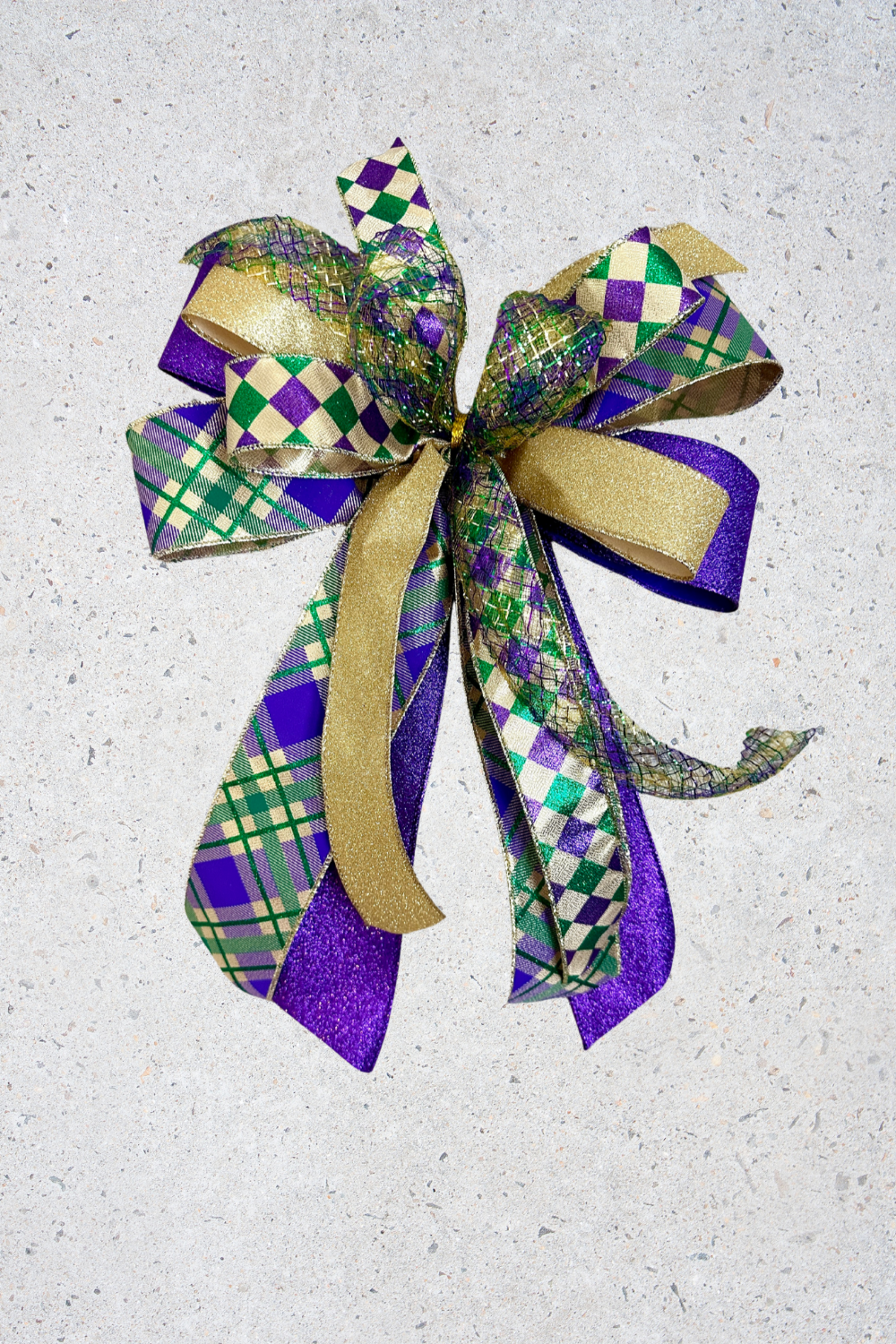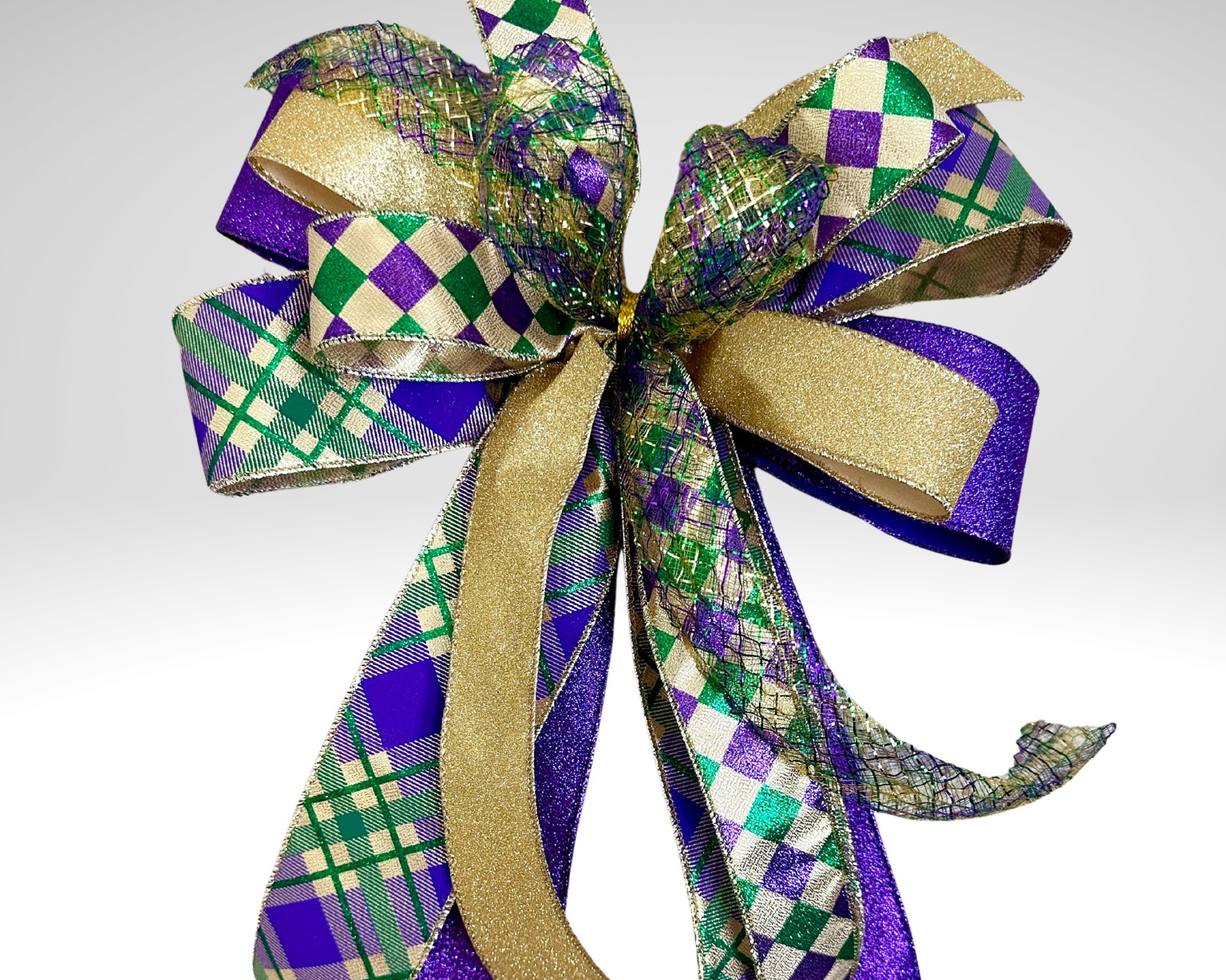 Five wired ribbons in Mardi gras colors and patterns. Our bows are made with high quality wired ribbons which you can store, fluff, re-shape and use again in future years.
