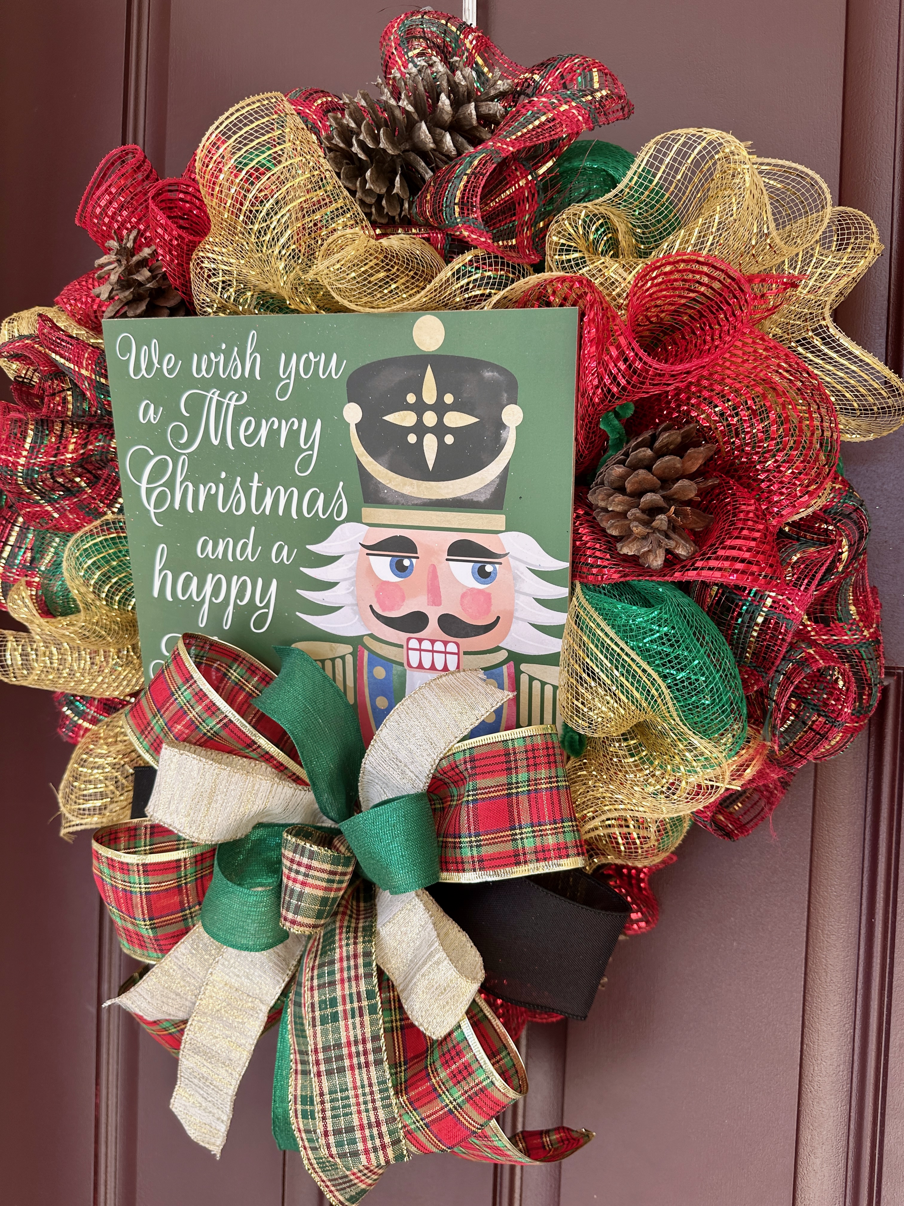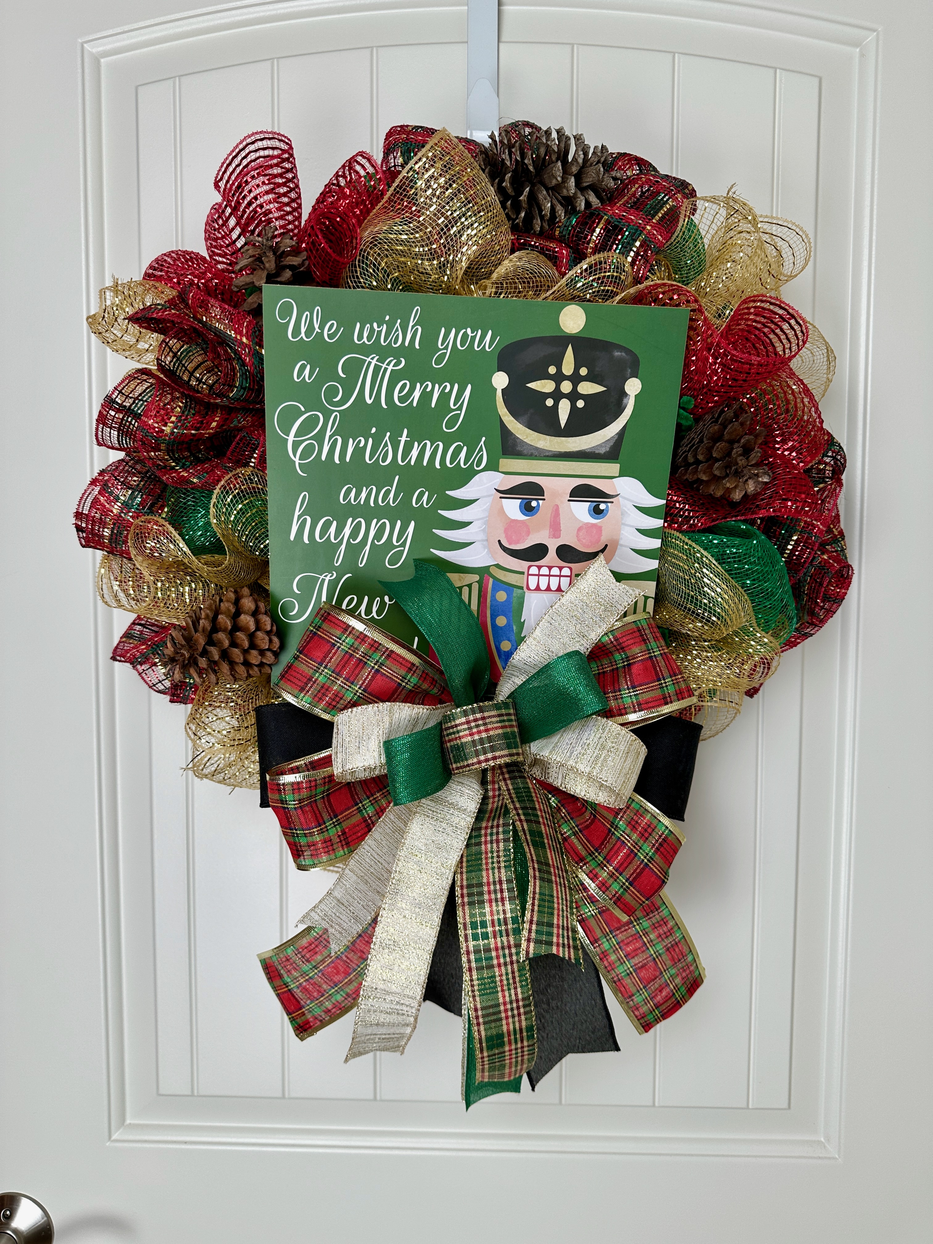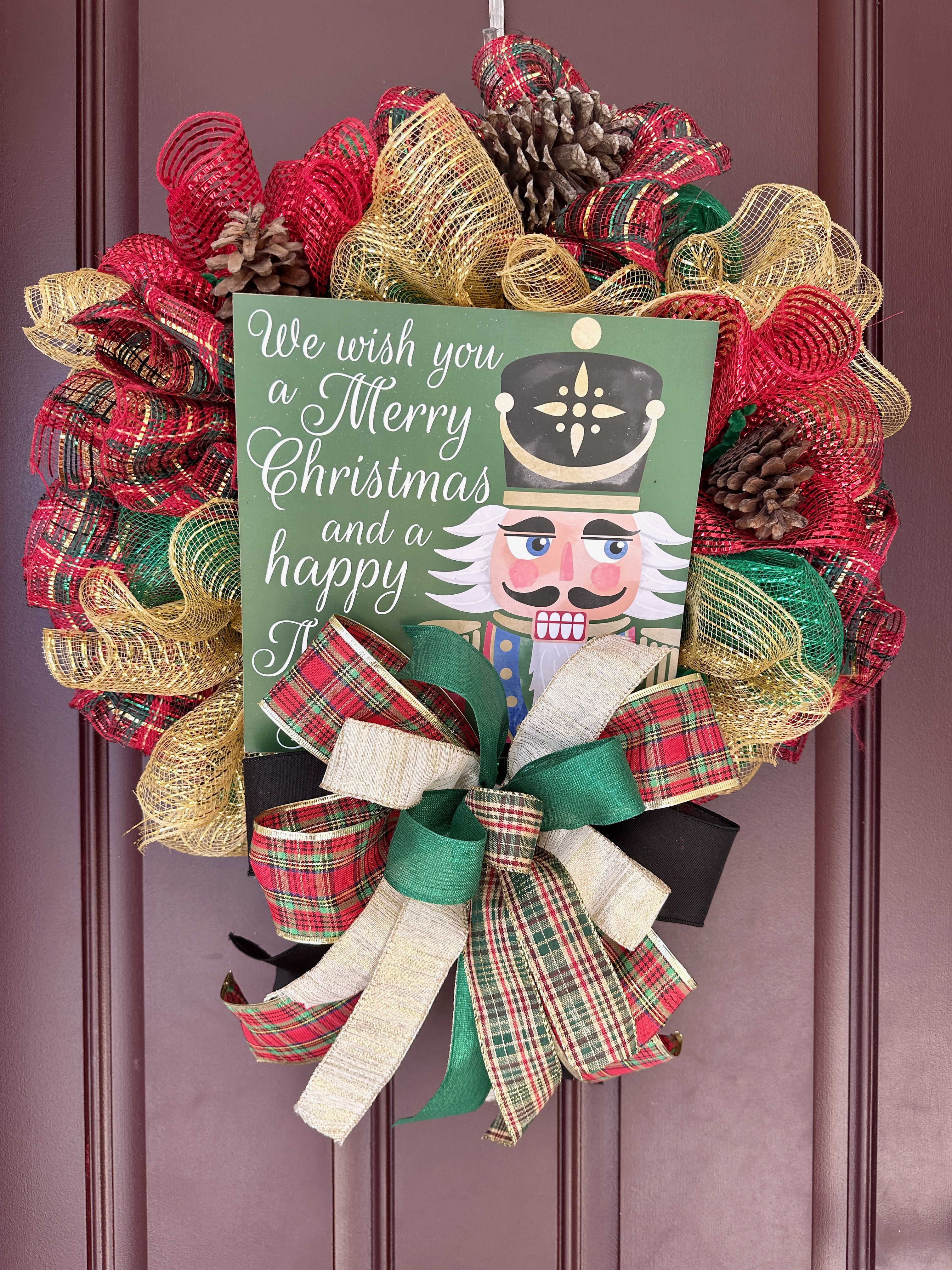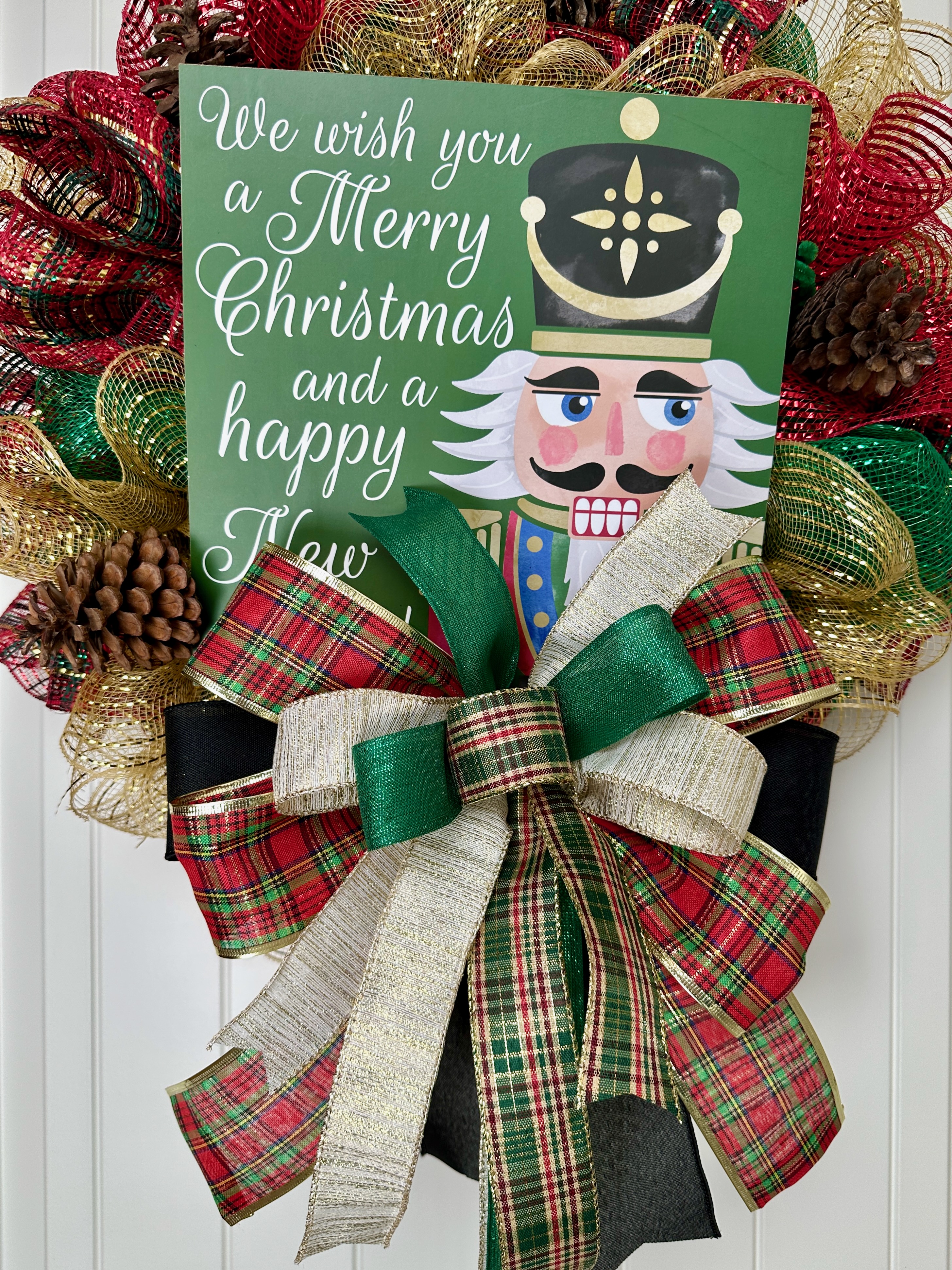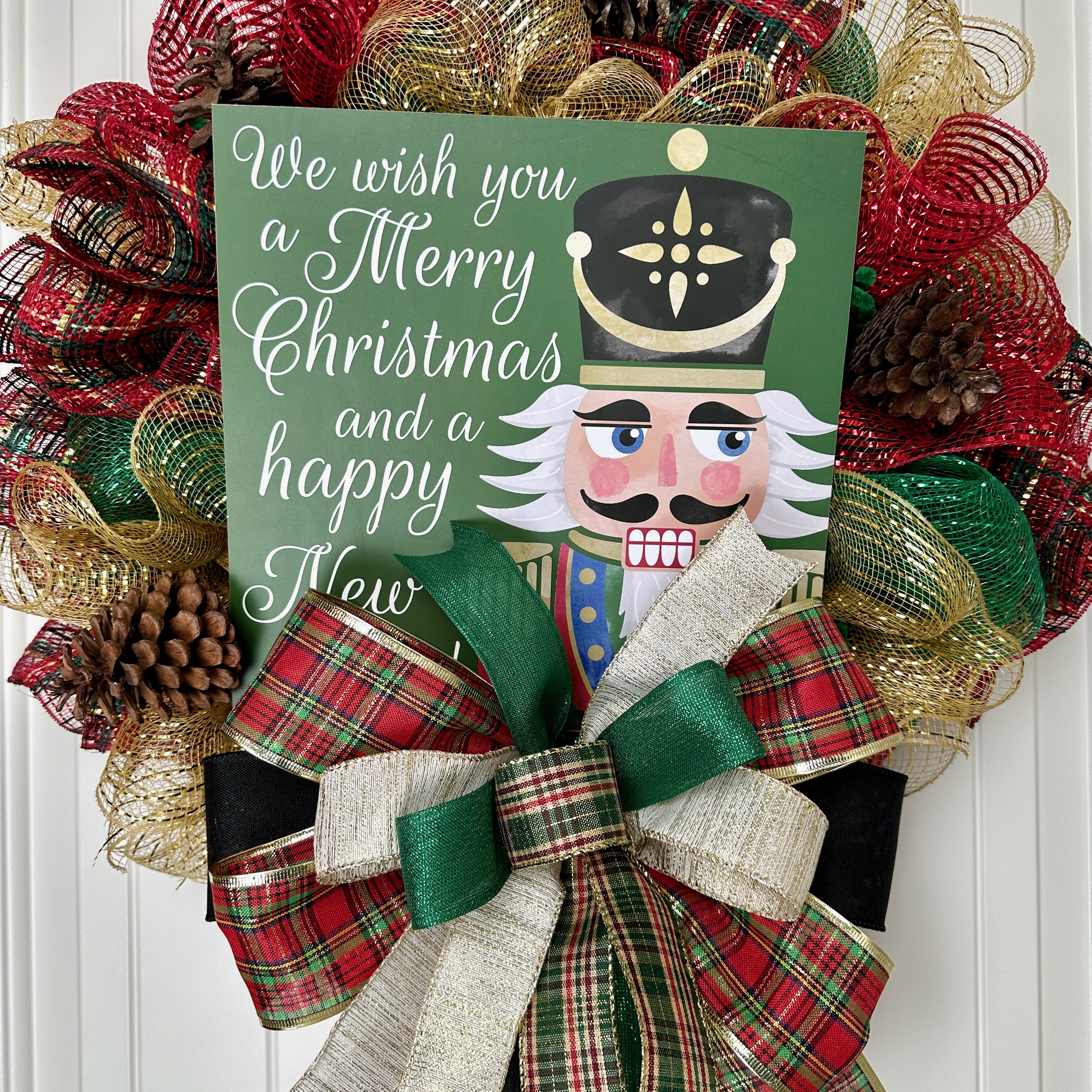 This nutcracker-themed wreath features a festive red and green Merry Christmas message. This inviting wreath will bring smiles and Christmas cheer to your home this season.