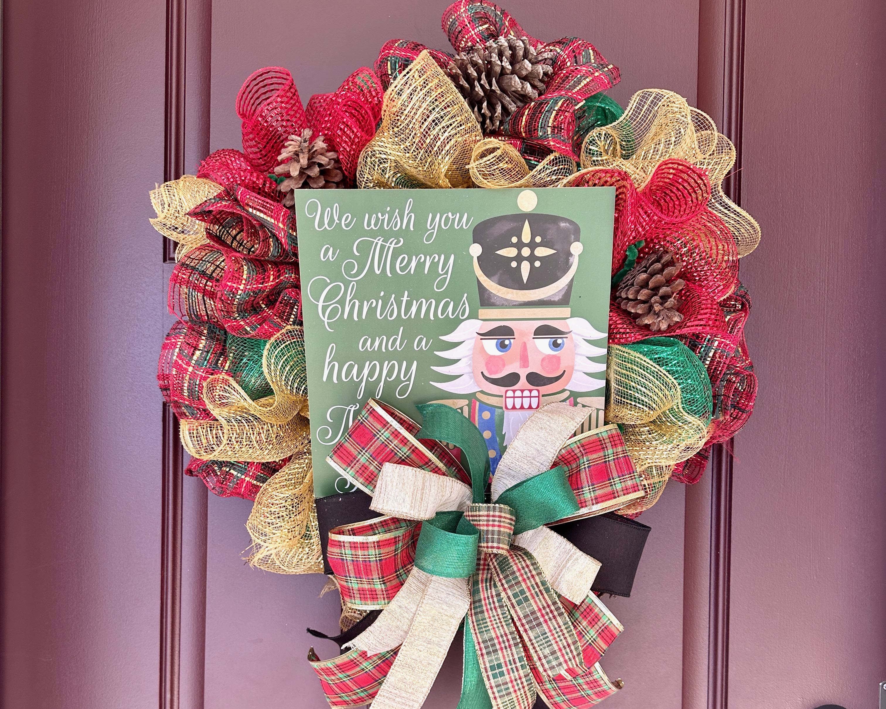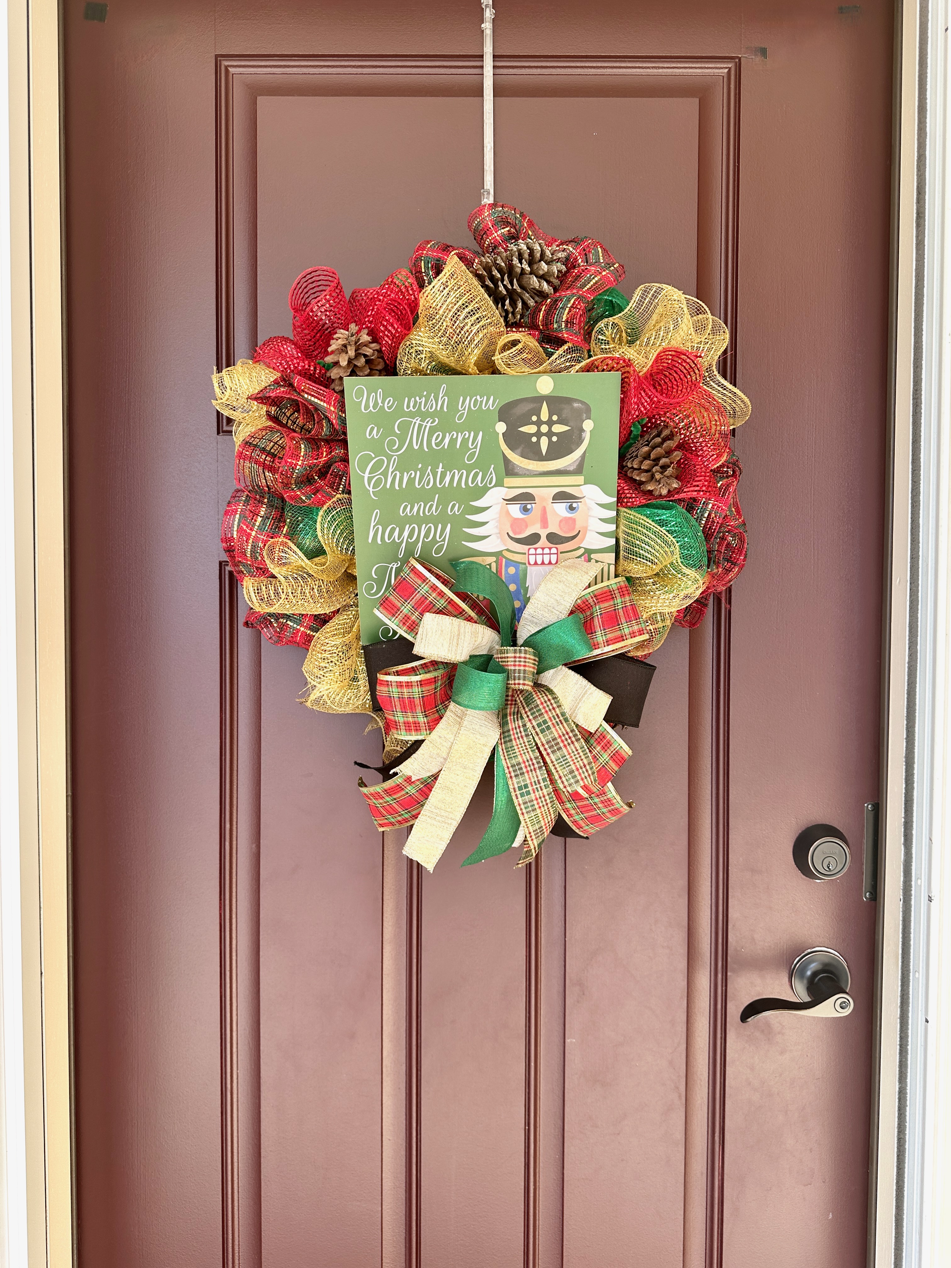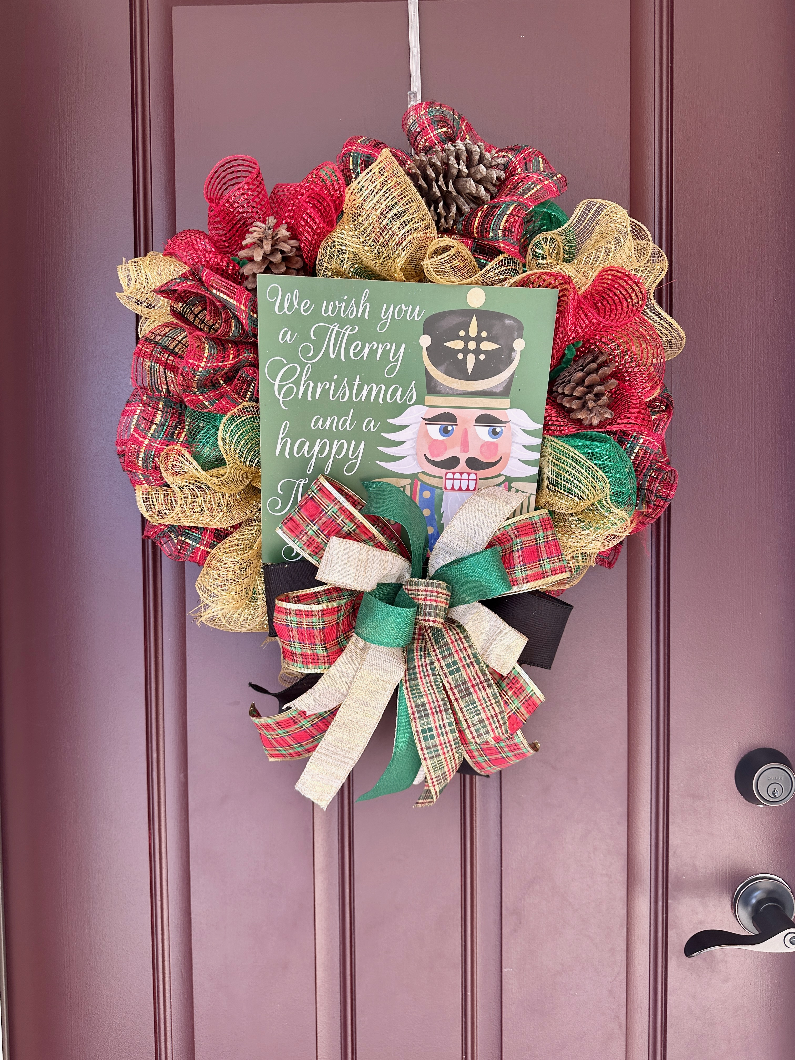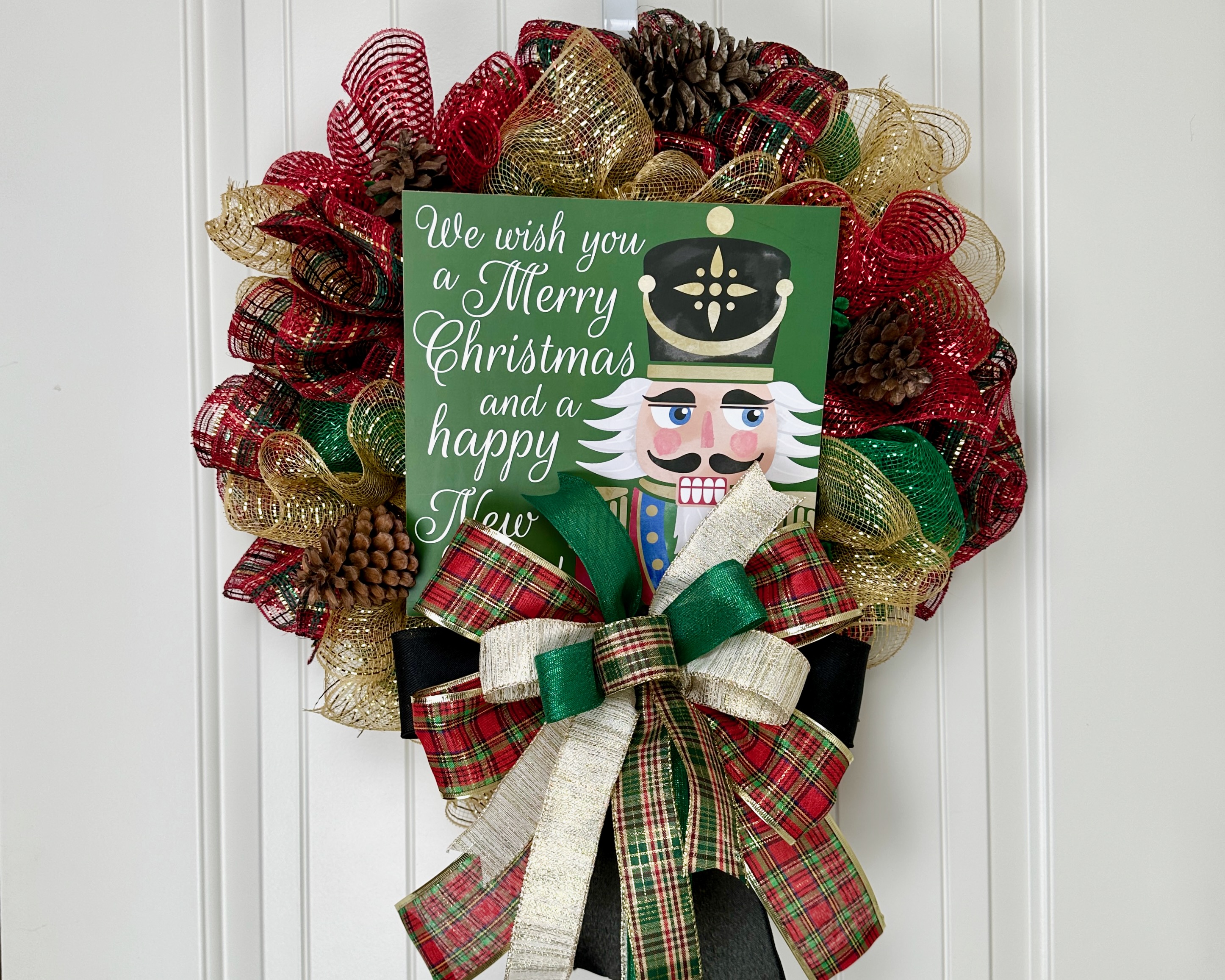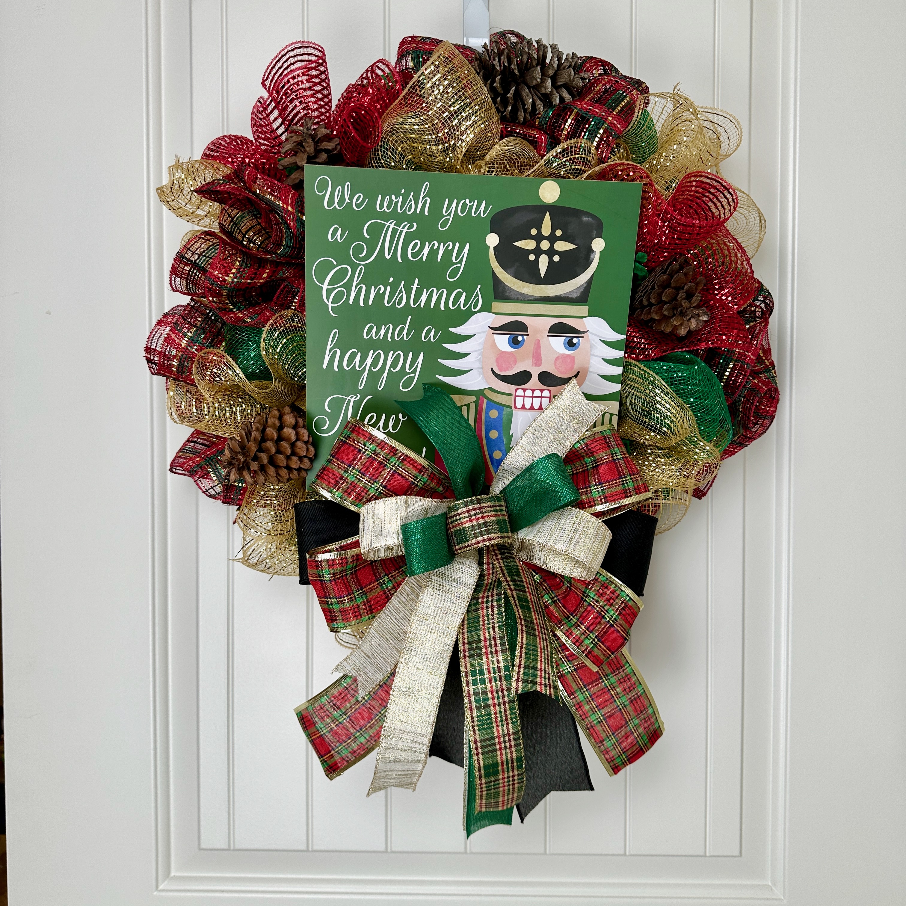 This nutcracker-themed wreath features a festive red and green Merry Christmas message. This inviting wreath will bring smiles and Christmas cheer to your home this season.