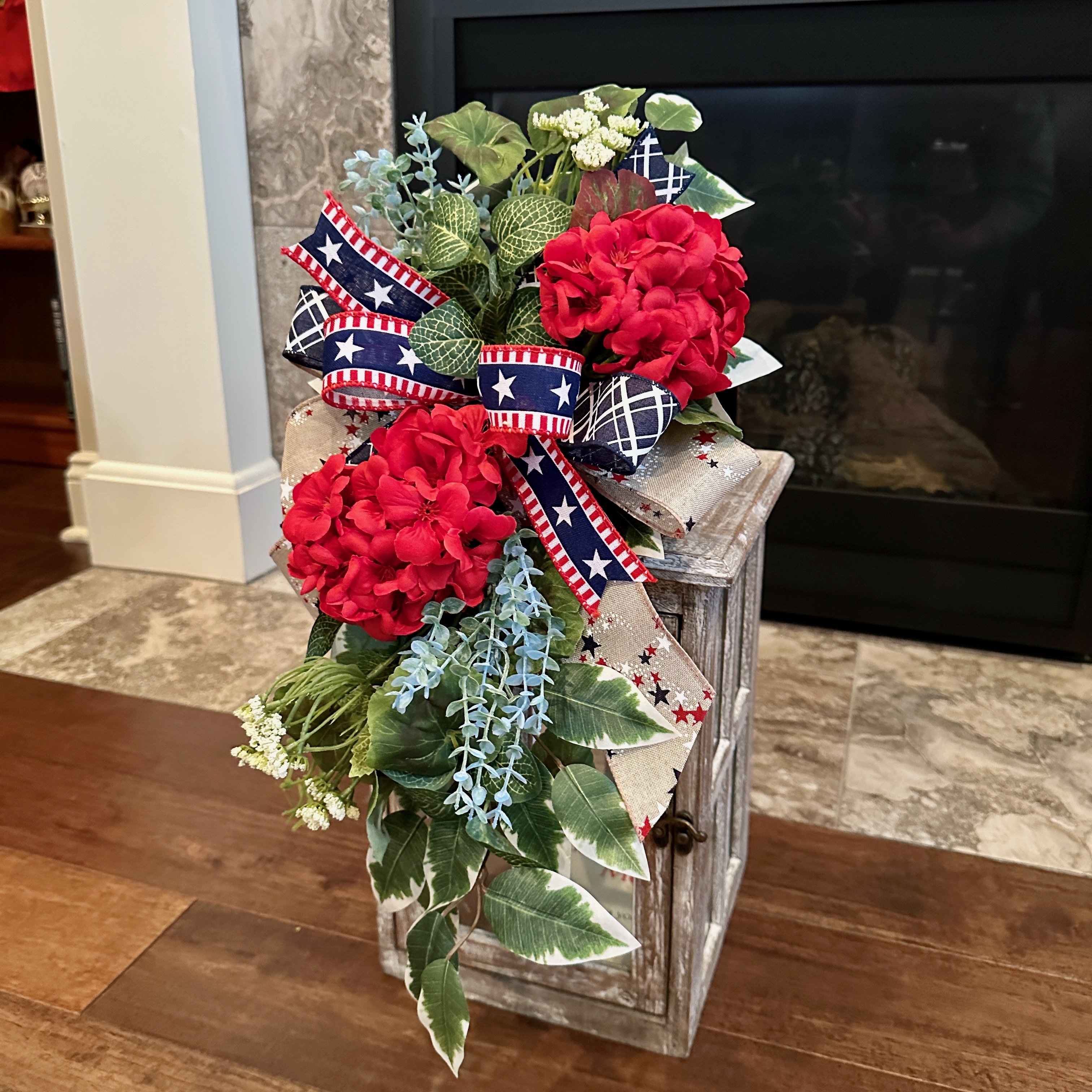 Classic red geraniums are attached on a bed of green white variegated ficus leaves, eucalyptus, queen anne's lace and baby blue eucalyptus. In the center is a large 10 inch bow made with 3 quality wired ribbons in patriotic patterns. Please note there is very minimal glue in this design. Elements are securely wired or tied to the base.