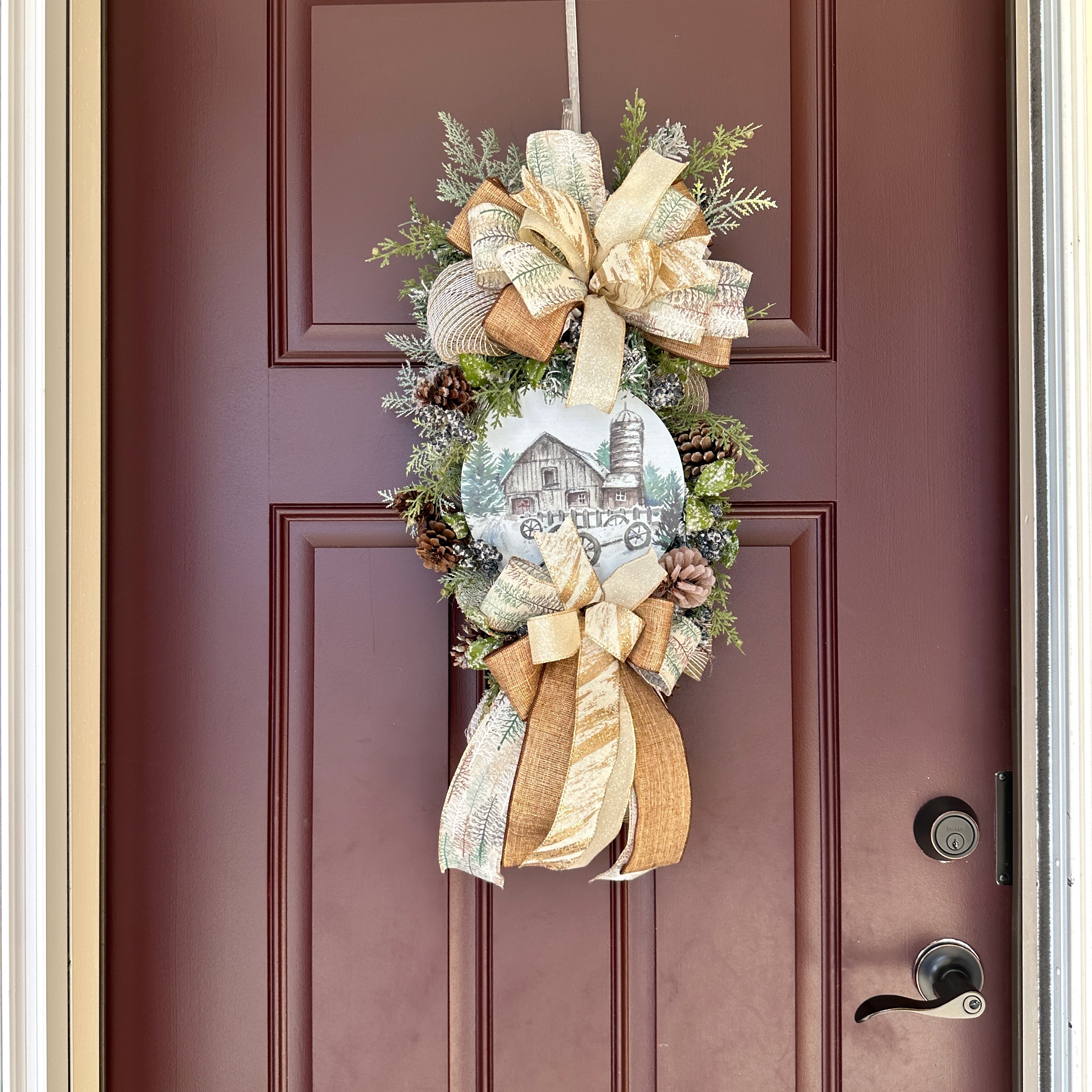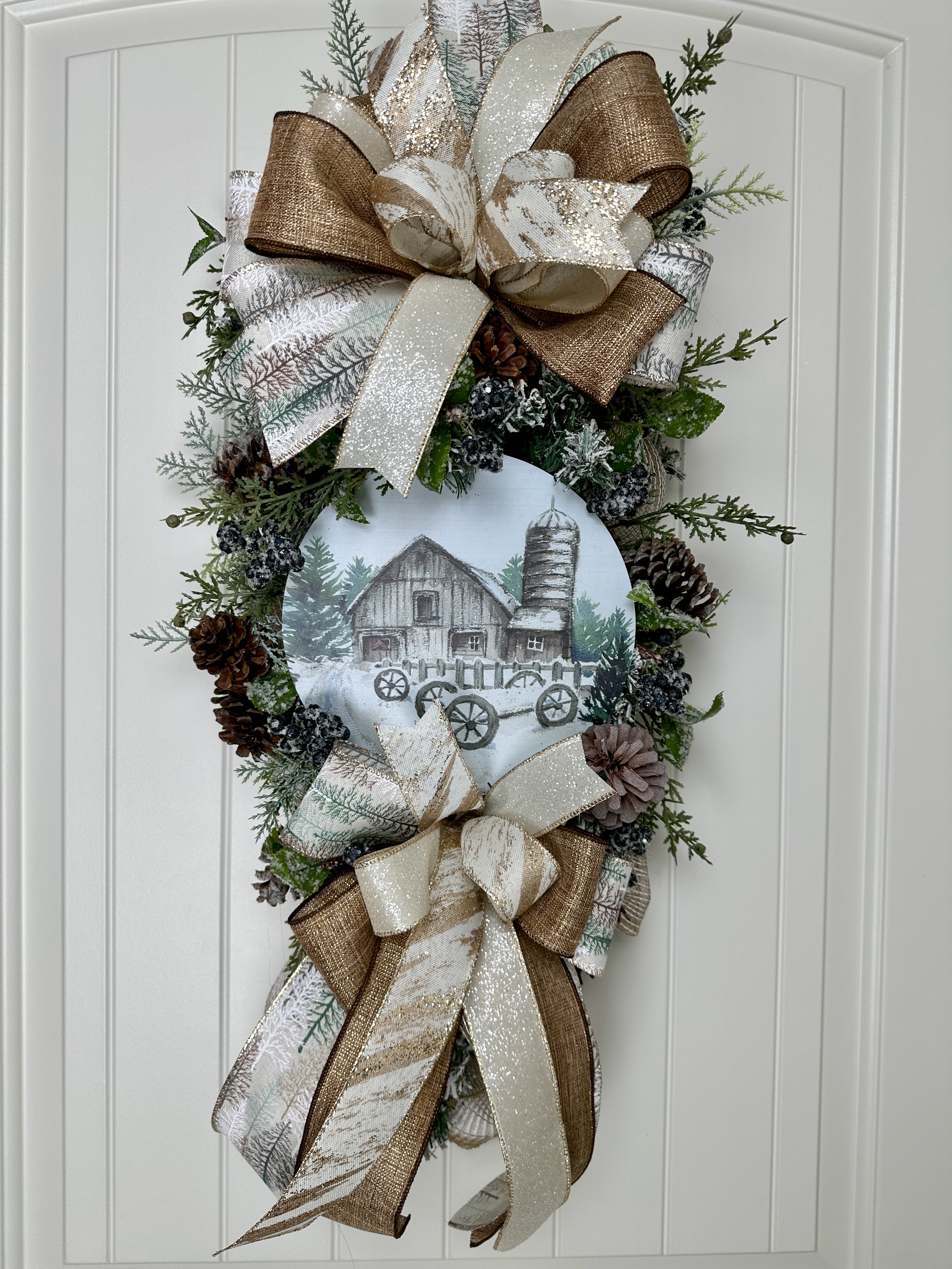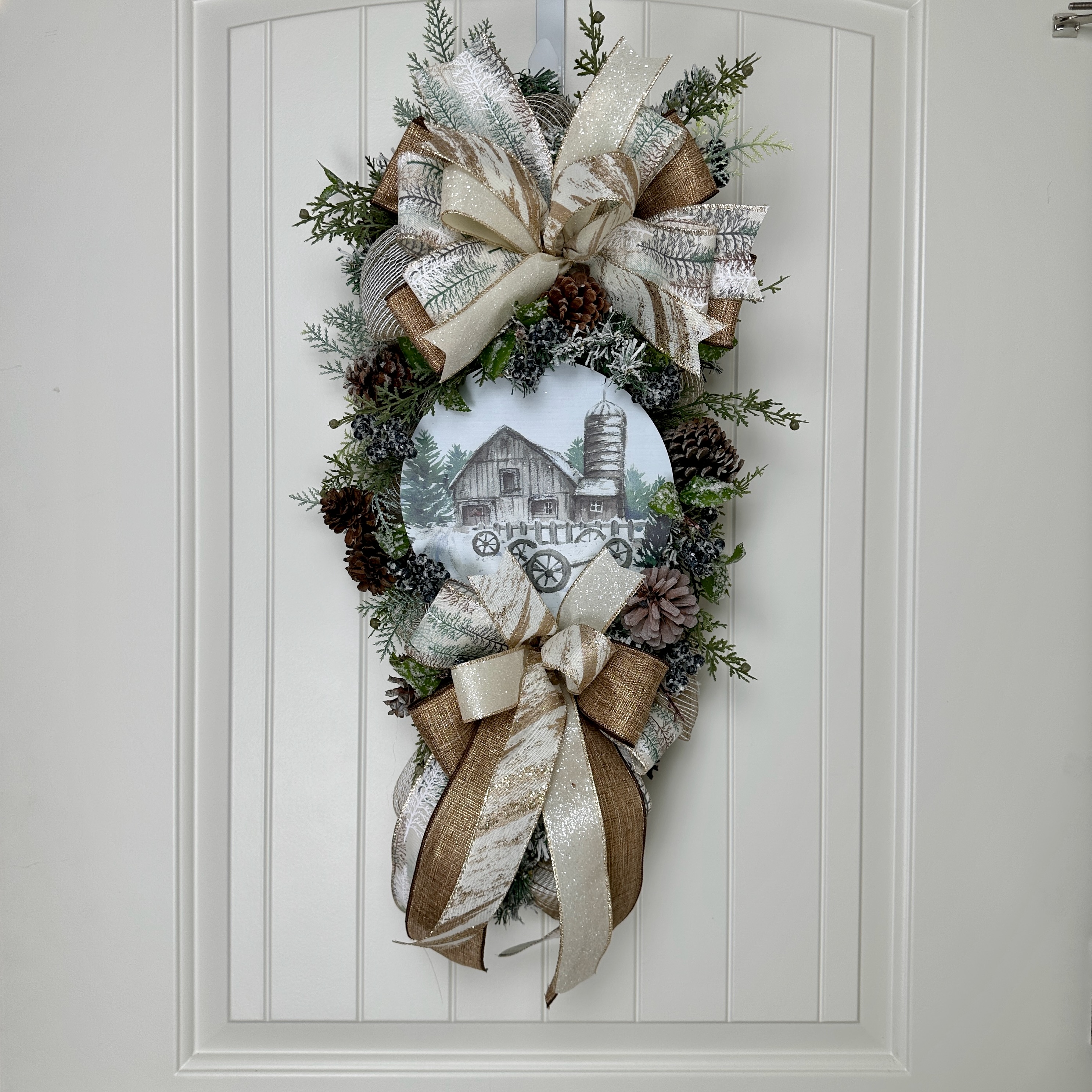 This evergreen teardrop swag with a winter barn scene will make an eye-catching winter display on your front door during and after the holidays.