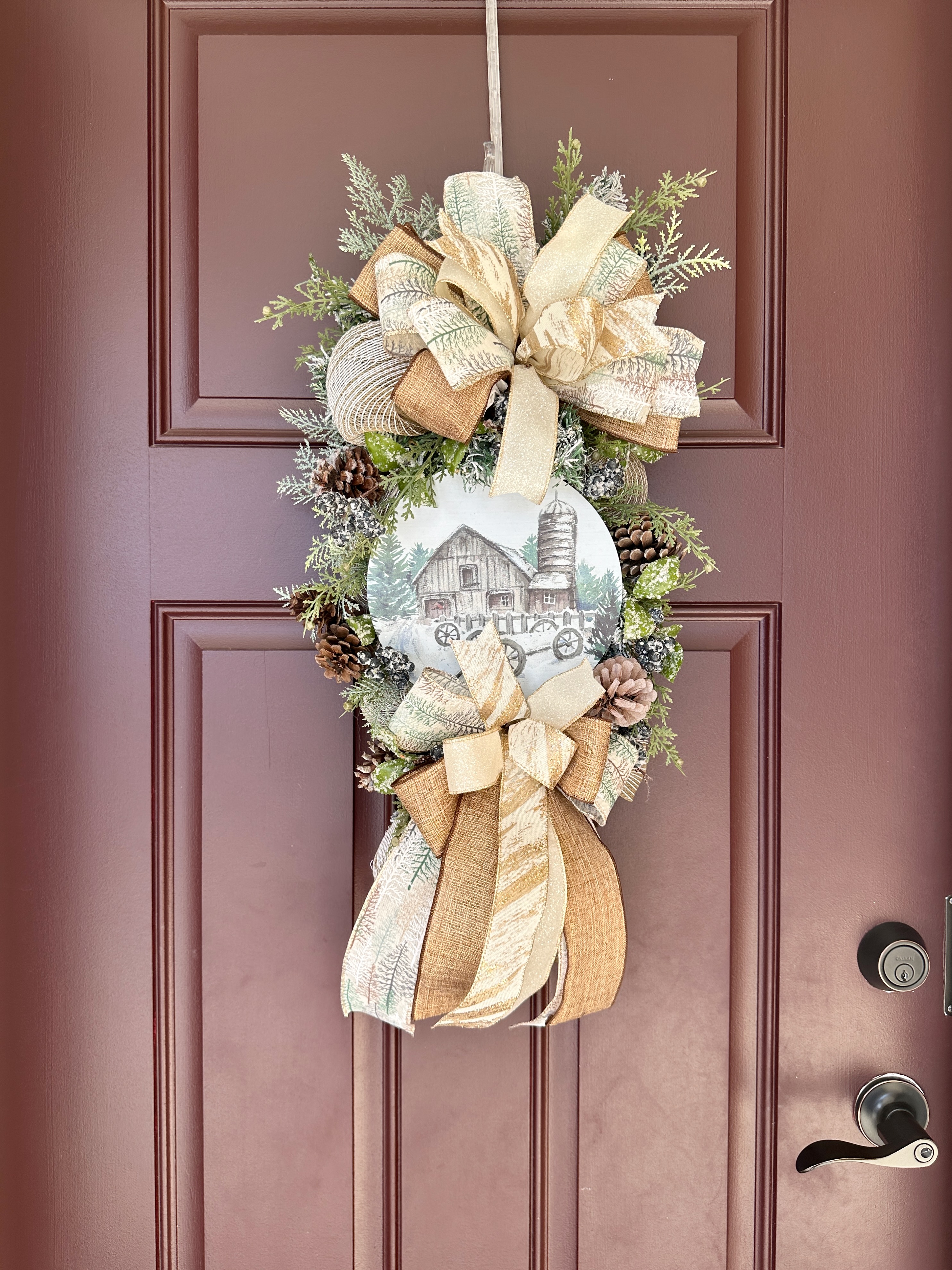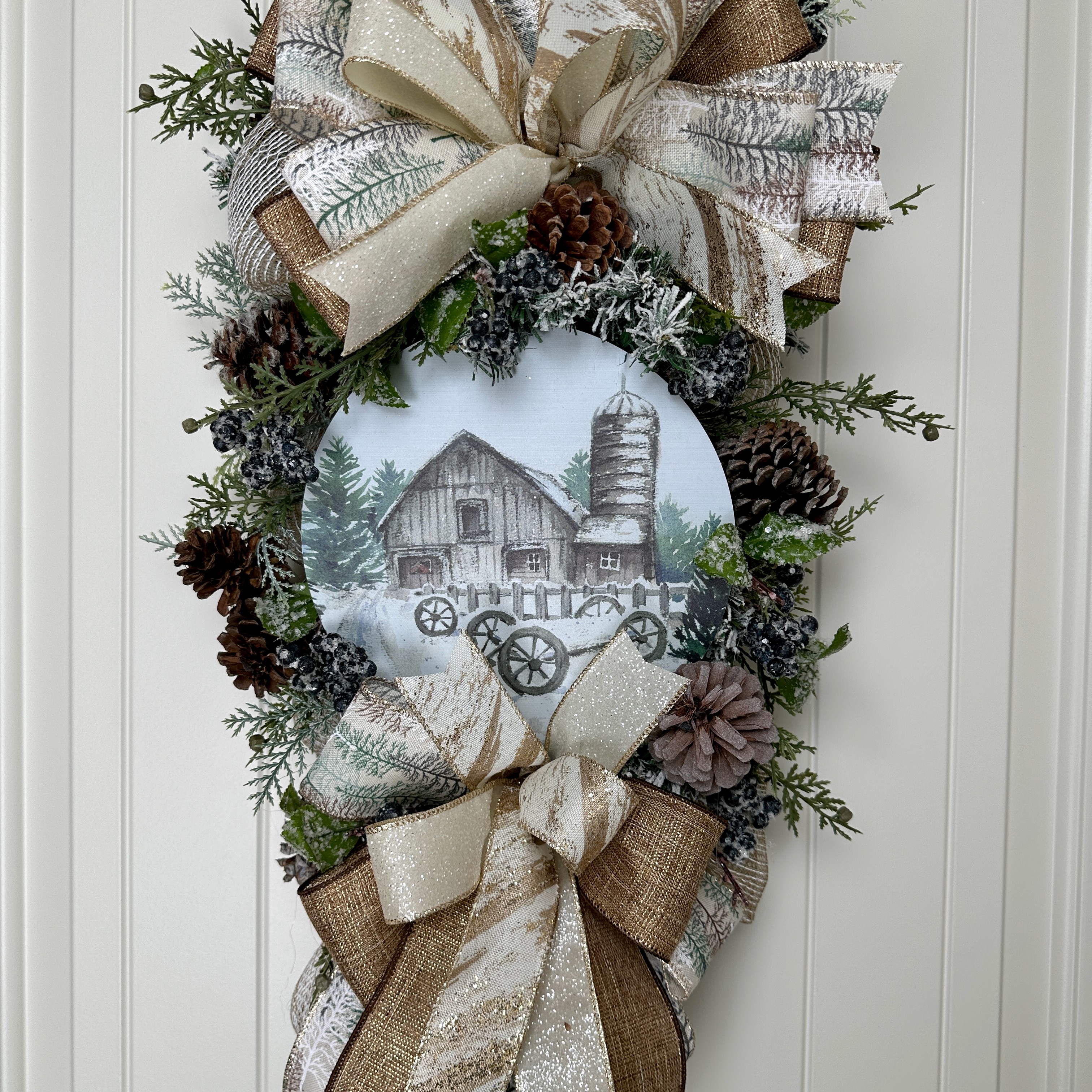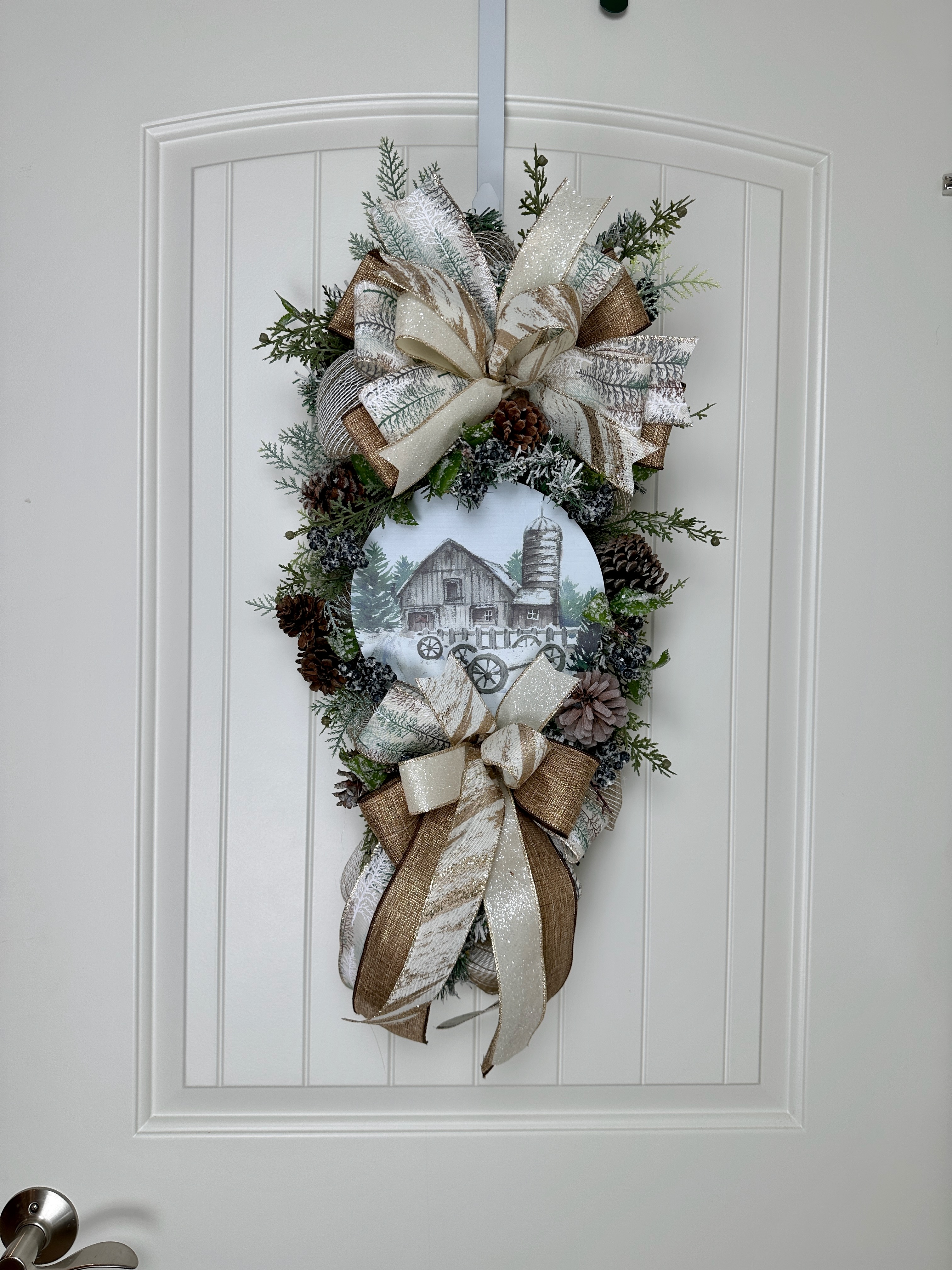 This evergreen teardrop swag with a winter barn scene will make an eye-catching winter display on your front door during and after the holidays.