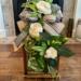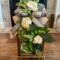 Pair of cream ranunculus florals with Queen Anne's lace, philodendron and boxwood greenery on a background of green and white variegated ficus leaves